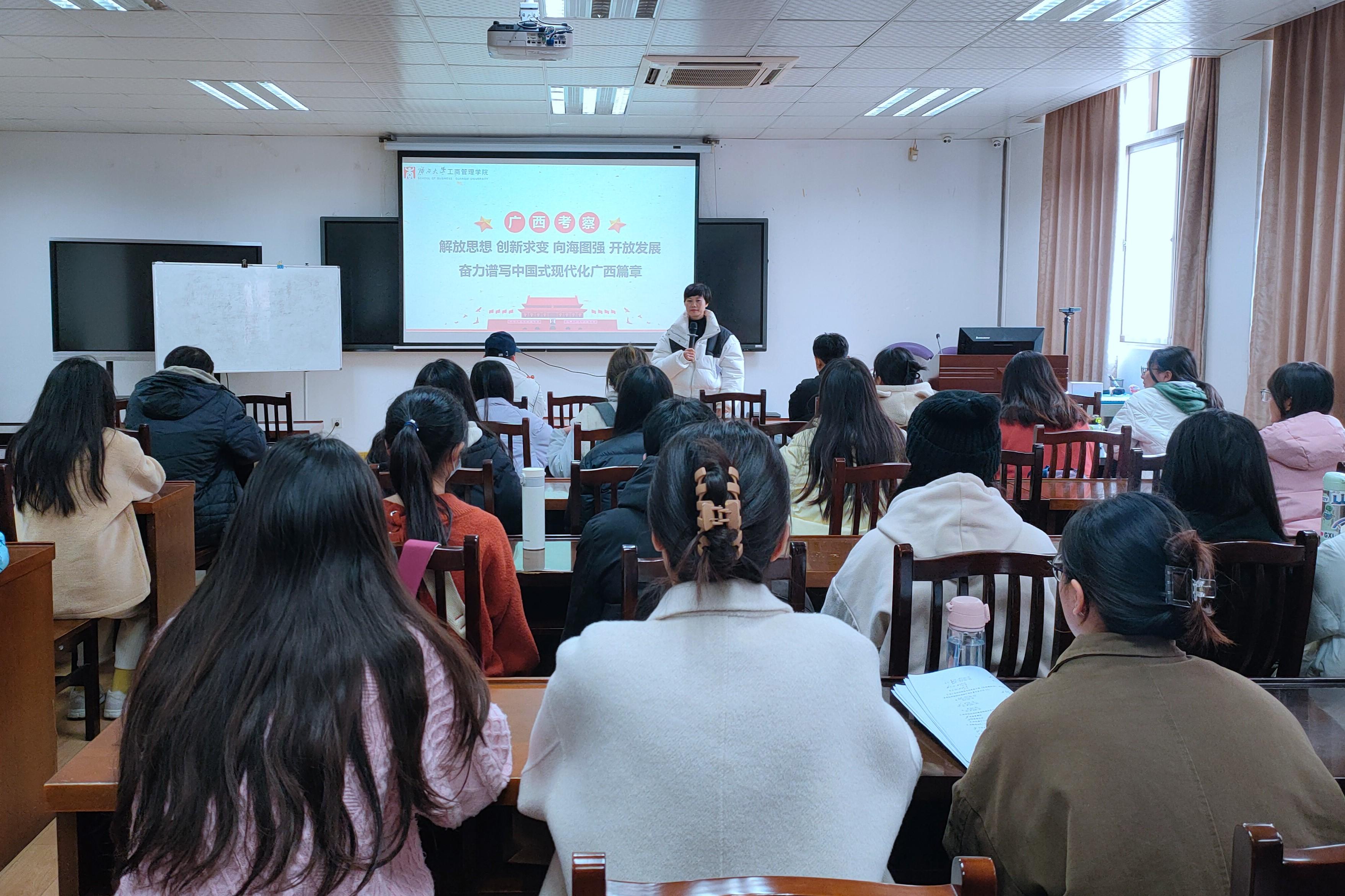 团委书记马丽娟希望同学们认真学习习近平总书记视察广西时的重要讲话精神,并通过青年大学习、学习强国等渠道,加强政治理论学习,紧跟党的步伐,听党话,跟党走,自觉将政治理论学习转化为指导自身专业学习和未来就业方向的思想武器,把个人的理想追求融入党和国家事业之中,勤于实践,勤于思考,扎根广西、建设广西、服务广西,为建设壮美广西贡献青春力量。