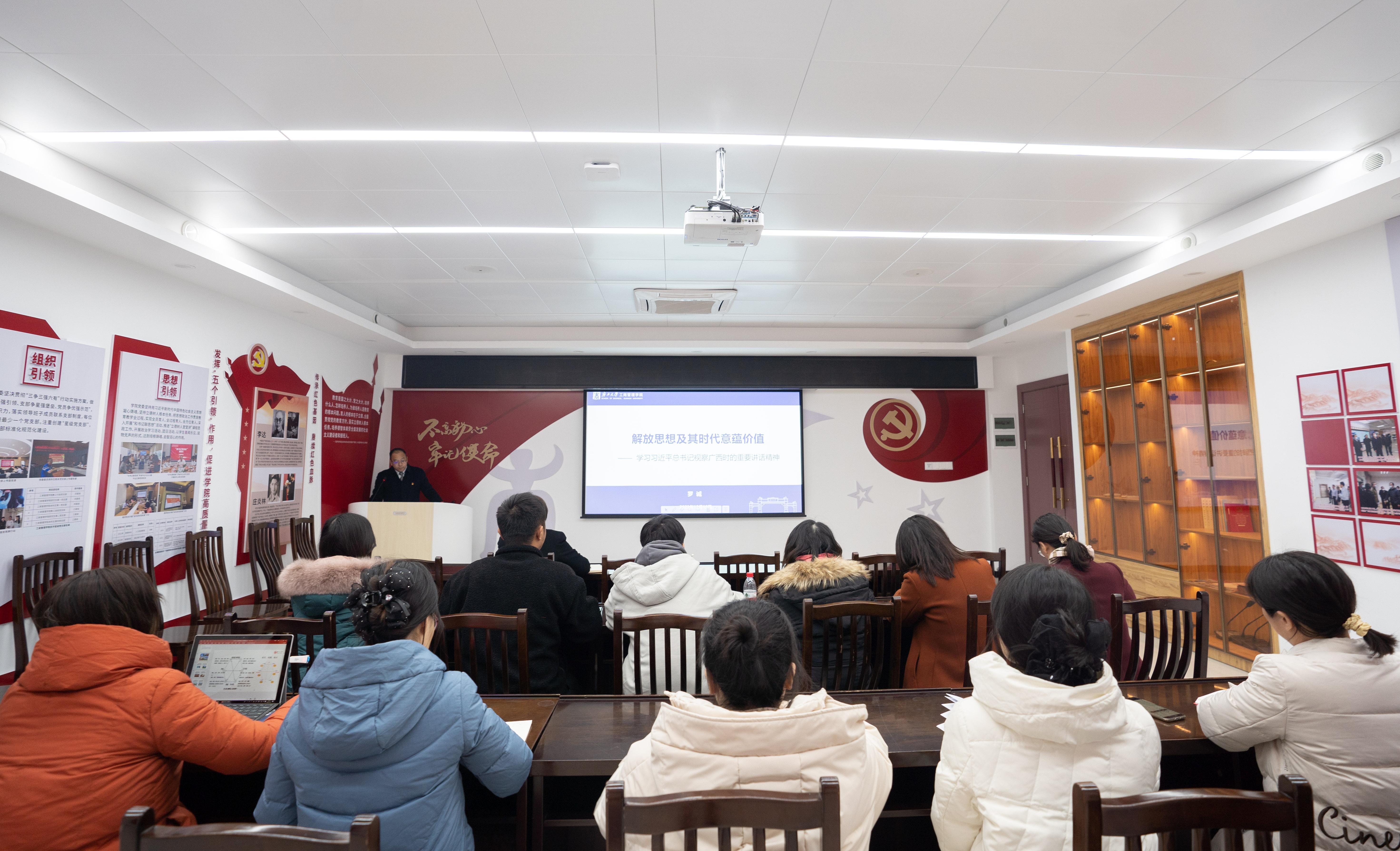 党委书记罗诚以《解放思想及其时代意蕴价值》为题,带领教工行政党支部全体党员学习习近平总书记视察广西的重要讲话精神。