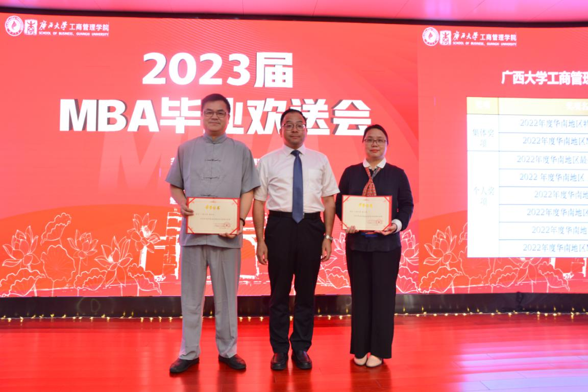 在热烈的掌声中,与会领导分别为获得华南地区2022年度最受欢迎MBA老师,华南联盟特色联合会、华南联盟MBA优秀班级、院级优秀毕业生颁发证书和纪念品。