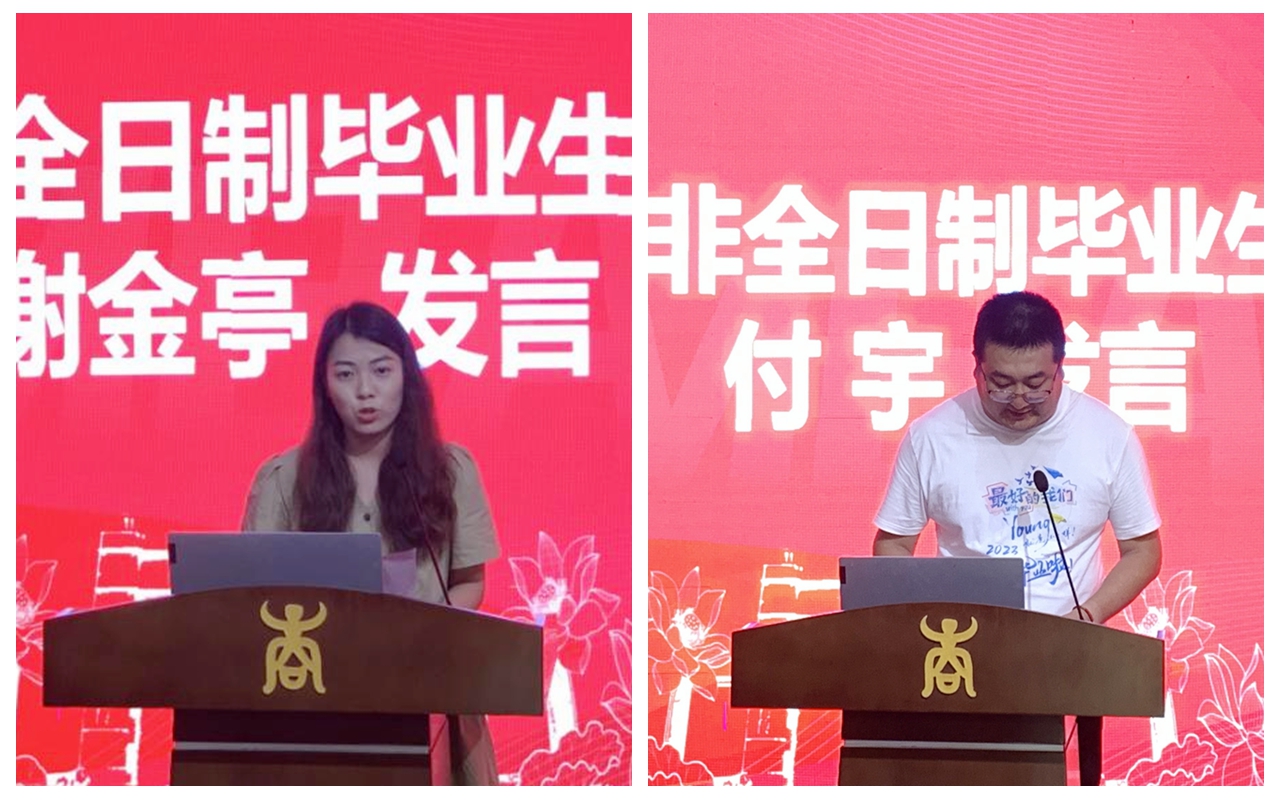 2023届MBA毕业生代表谢金亭、付宇向母校的辛勤培育表达了诚挚的感谢,他们表示,经过两年的学习,大家共同进步,收获满满。毕业并不意味着结束,而是一个新的开始。在未来的工作中他们将继续努力,真正成为奋进新时代的复兴栋梁。
