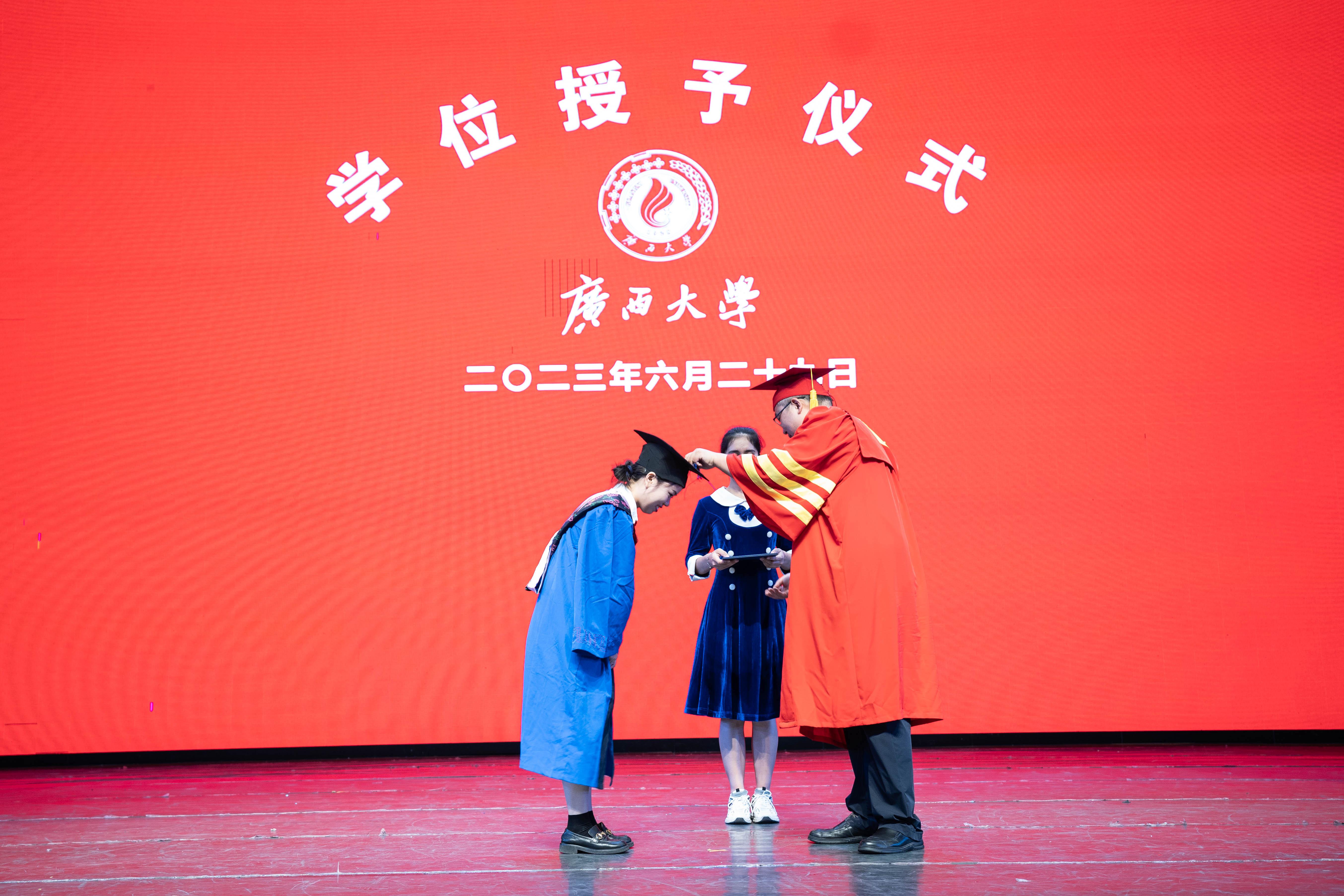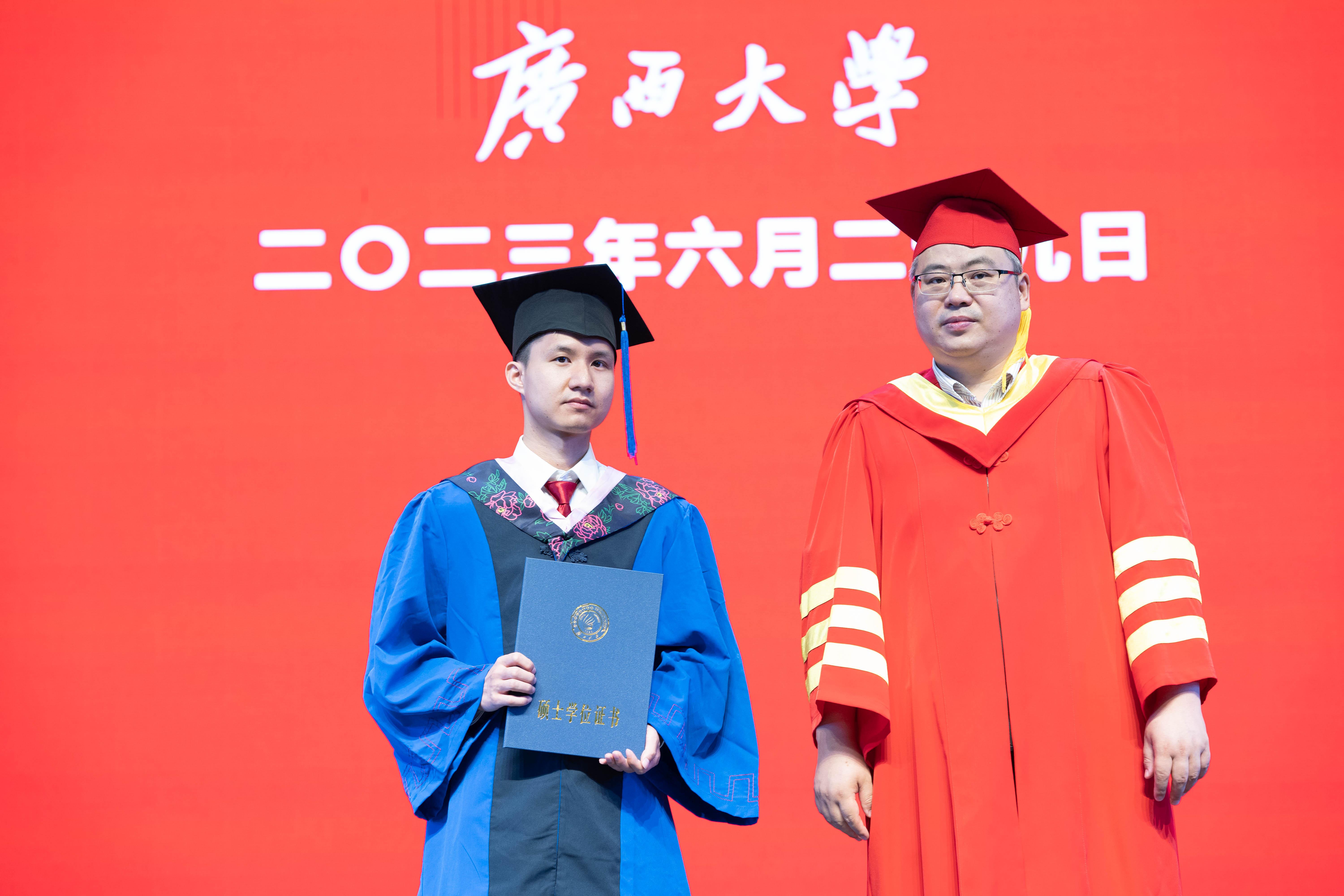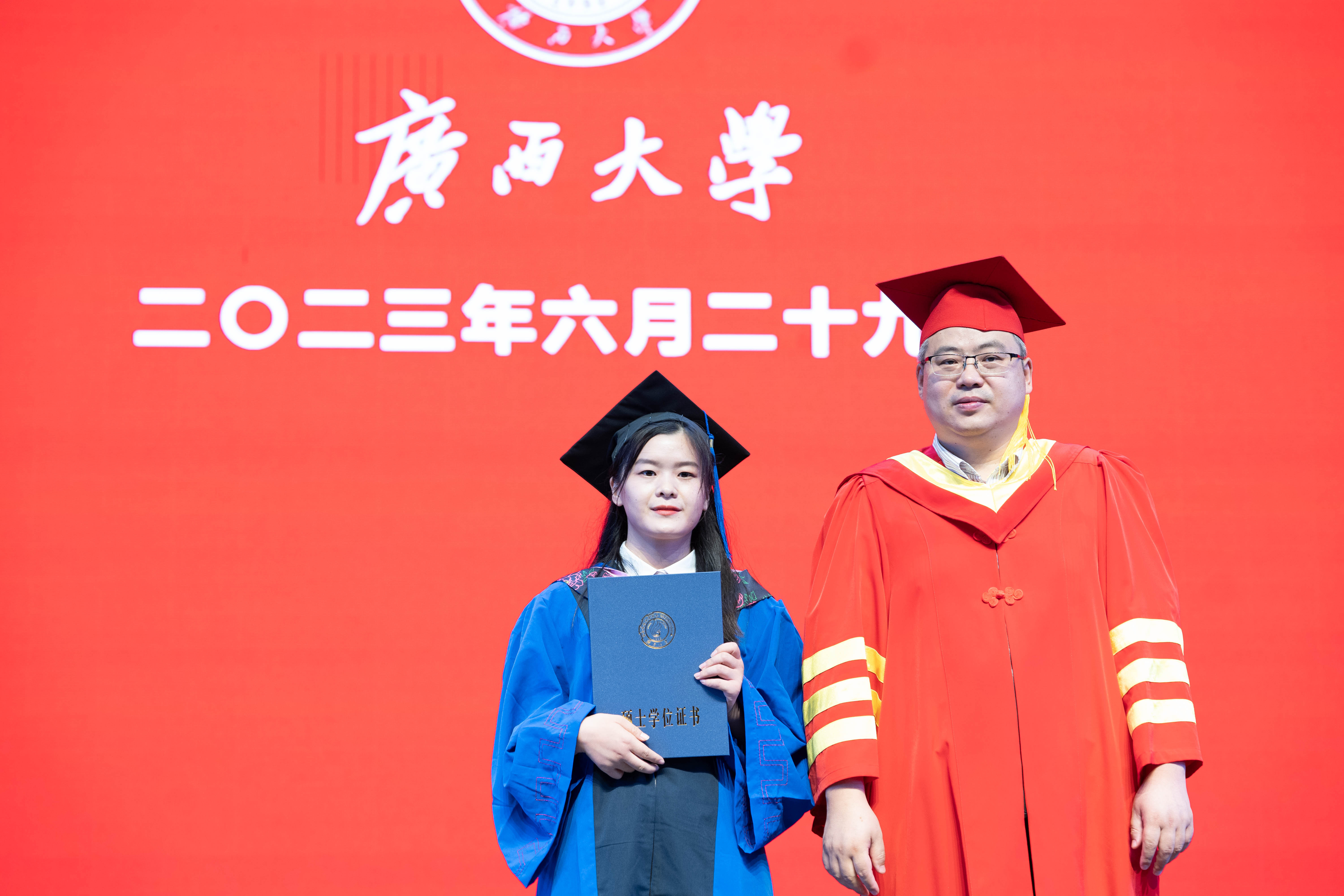 党委书记罗诚为获得广西普通高等教育优秀毕业生、广西大学优秀毕业生荣誉的毕业生代表颁发证书,并赠送毕业礼物。