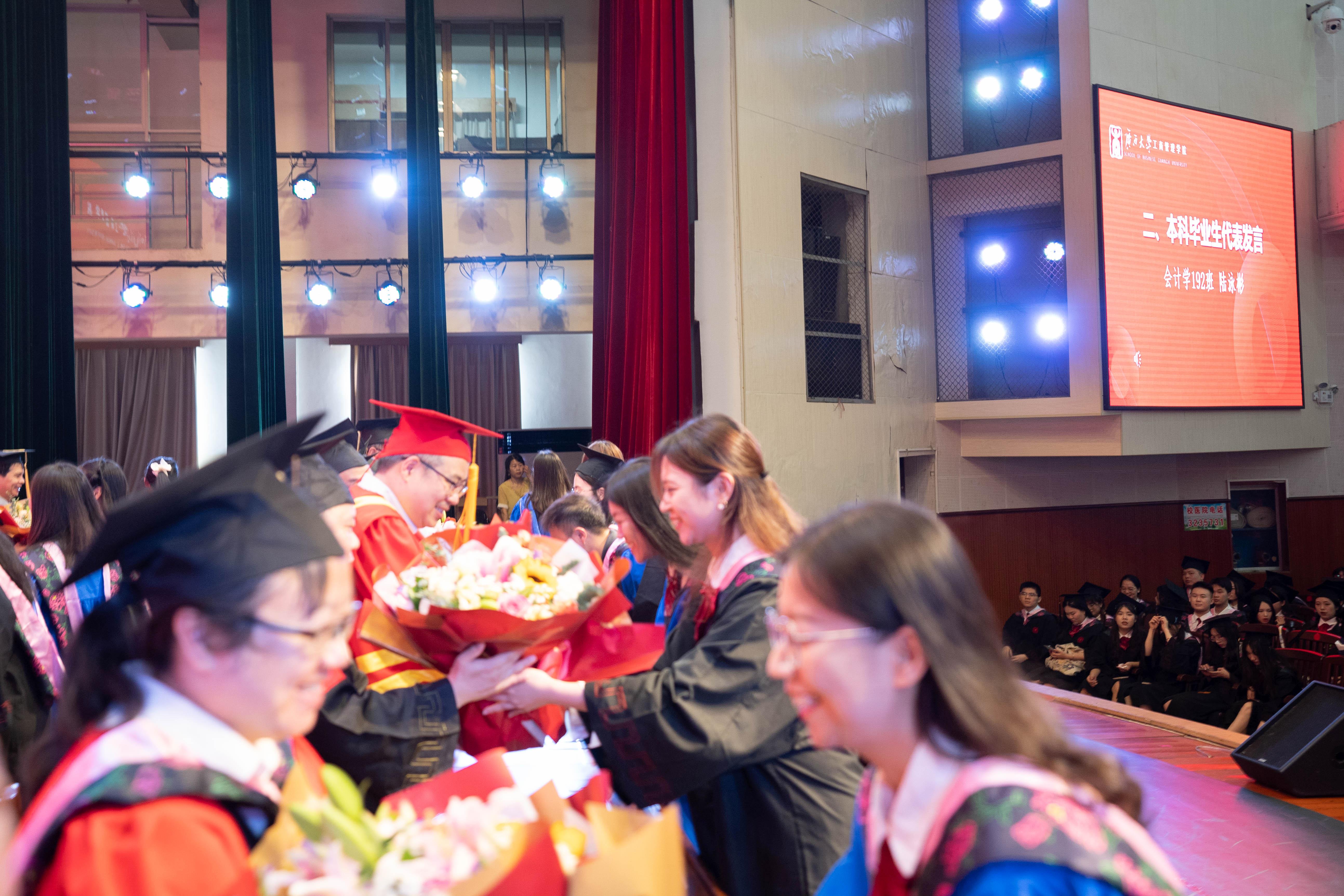 毕业生依次走上主席台接受授位。朱帮助院长为每一位毕业生颁授证书、拨穗正冠,各系教师代表与毕业生握手。