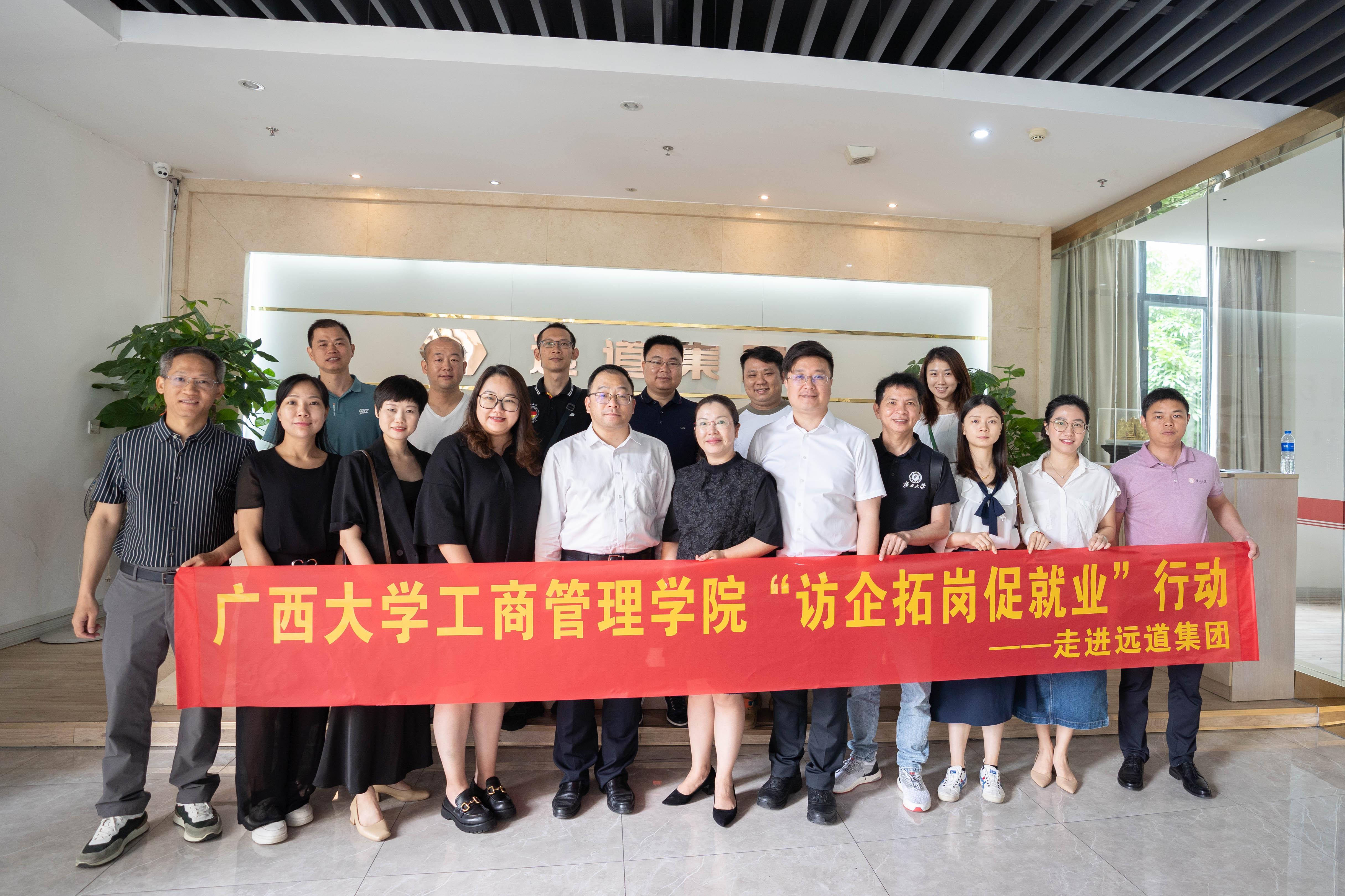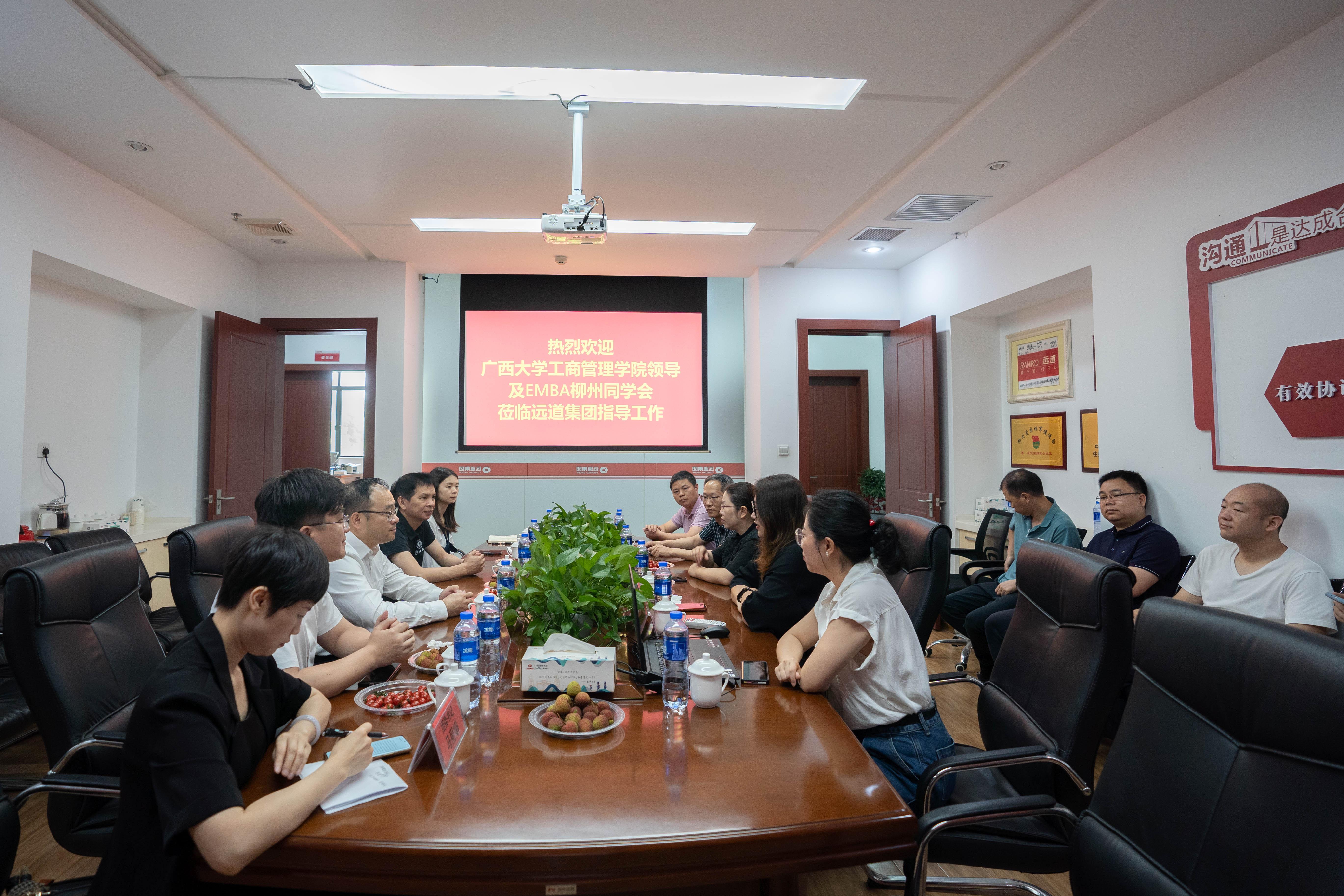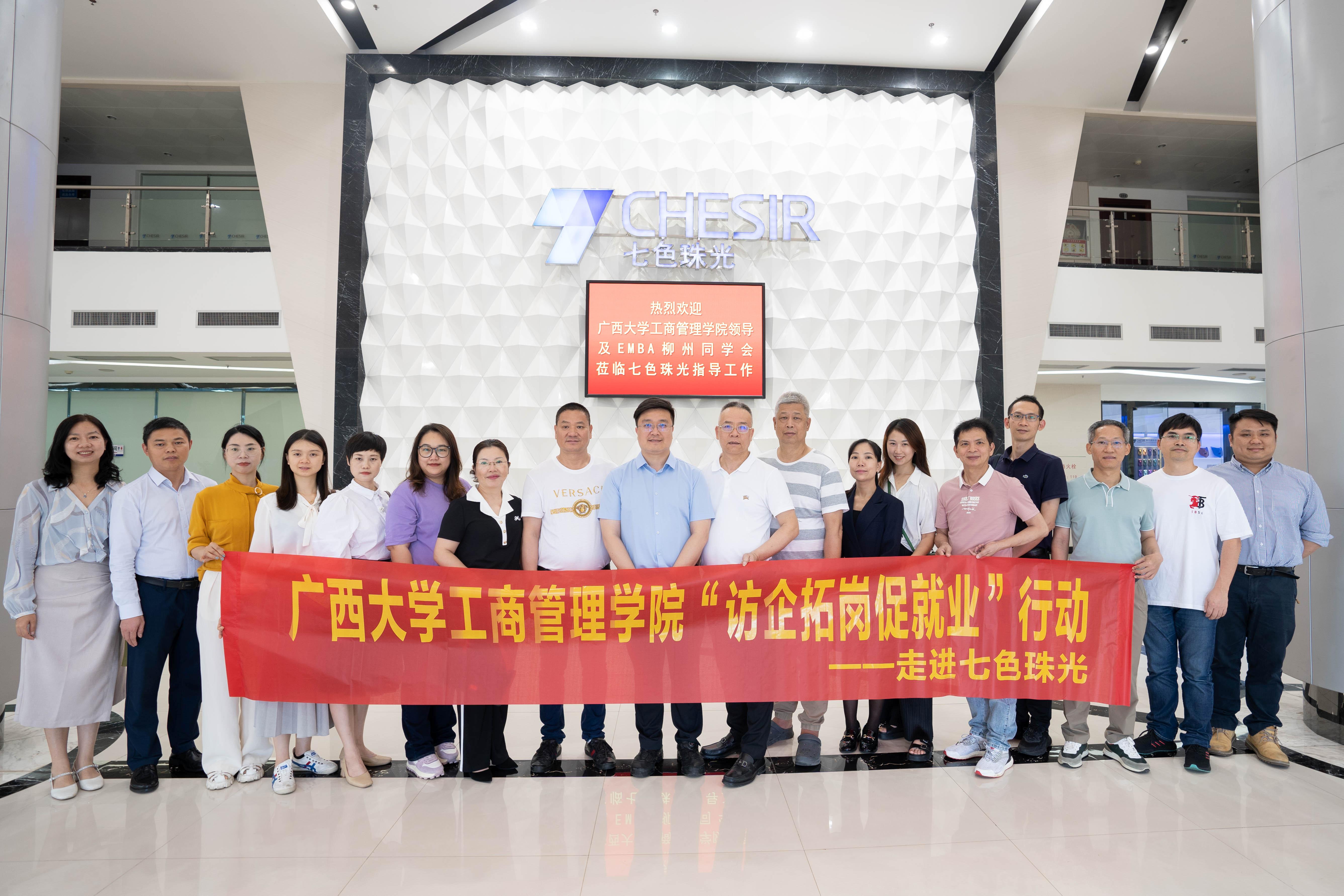 党委书记罗诚、党委副书记黄晋、副院长朱少英带队到柳州校友企业广西七色珠光材料股份有限公司(以下简称为“七色珠光”)、广西远道投资集团调研(以下简称为“远道投资”),开展“访企拓岗促服务”专项行动,团委书记马丽娟、组织员黄照温等相关老师,以及EMBA柳州校友会部分代表参加此次活动。