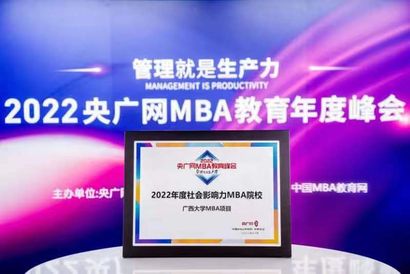 广西大学MBA项目在风起云涌的大变革里书写中国故事,在中国经济发展与世界相容舞台上贡献管理智慧,产生了积极而深远的社会影响,荣获“2022年度社会影响力MBA院校”荣誉。
