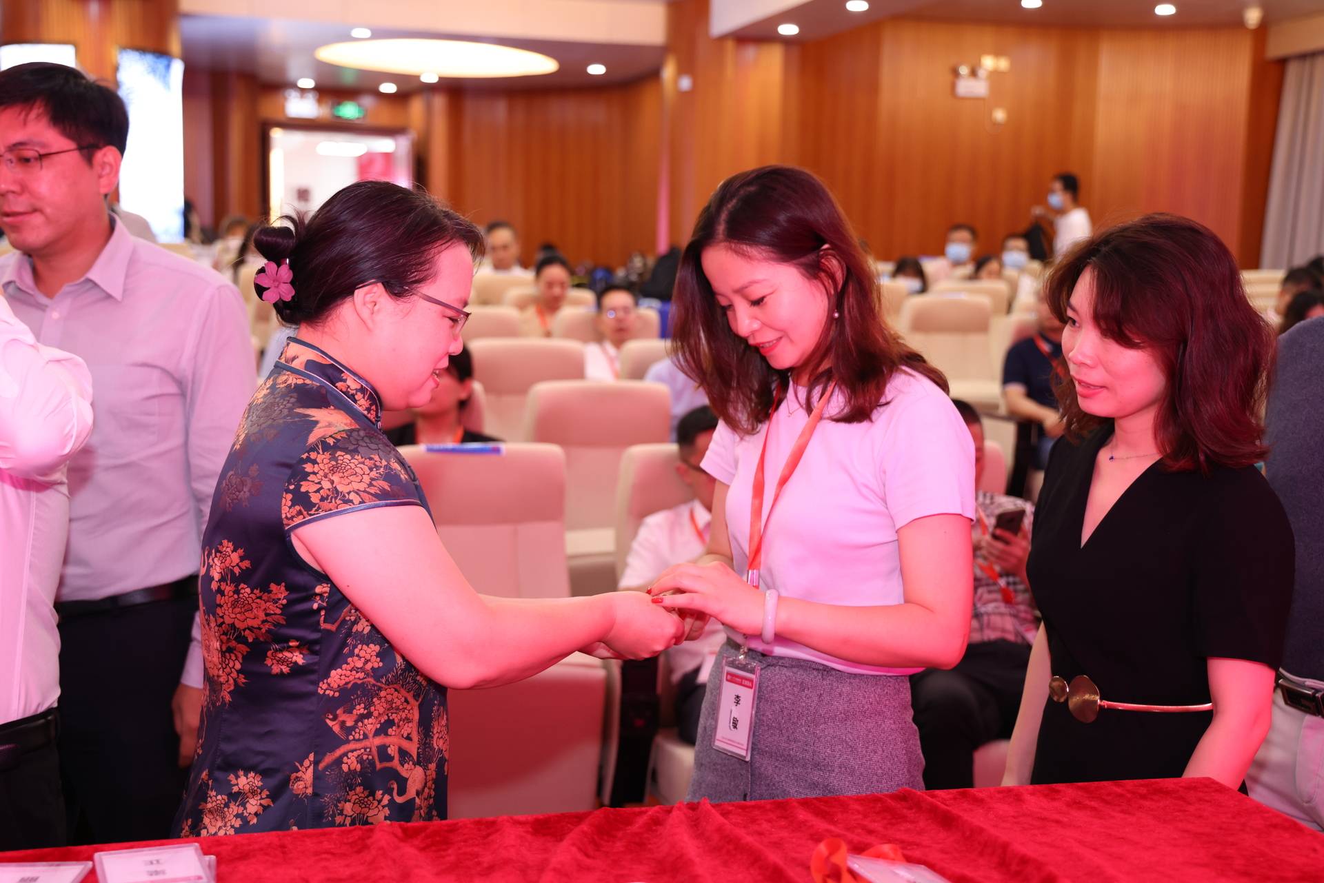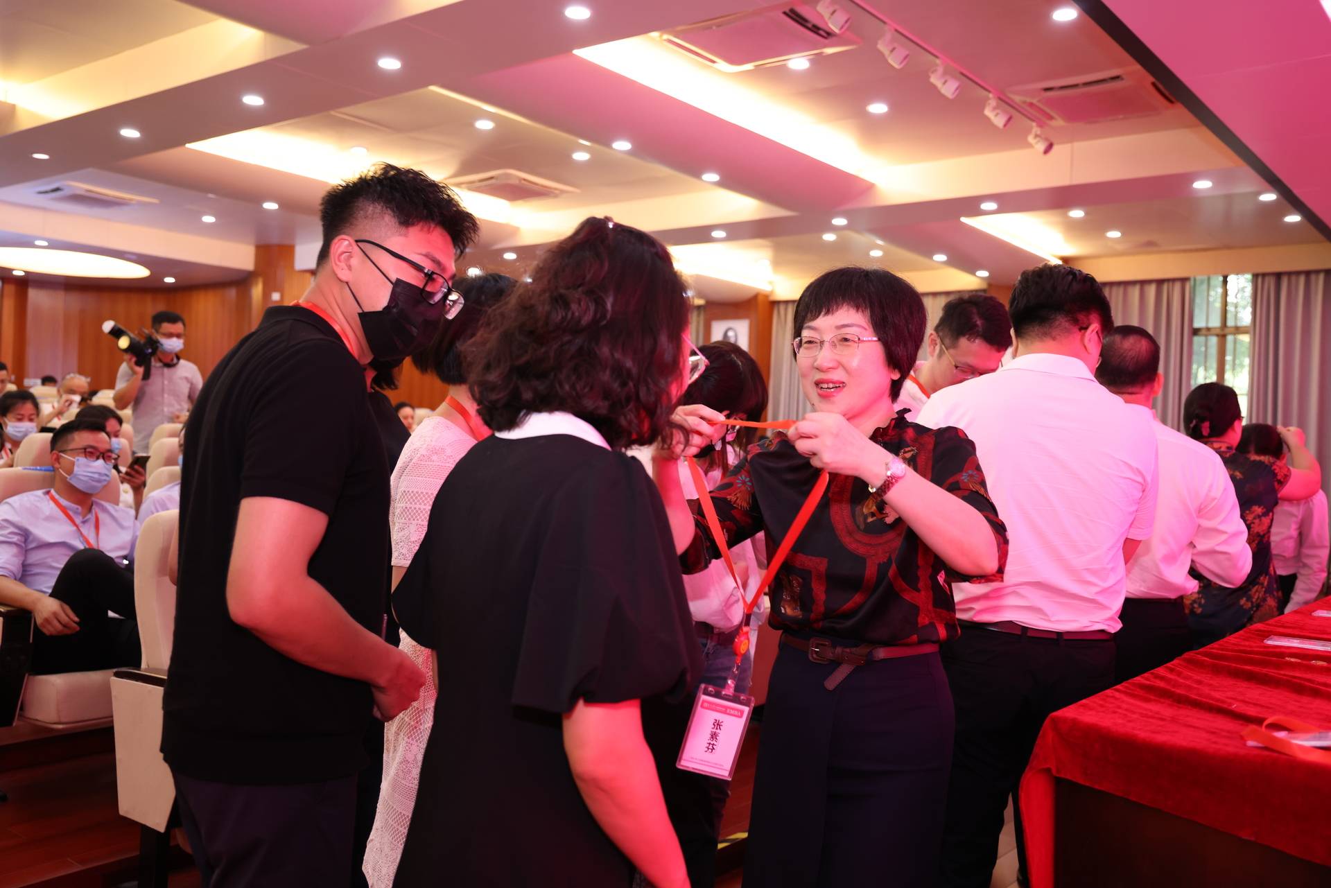 廖东红副院长为EMBA新生佩戴广西大学EMBA学员证,赠送广西大学校徽