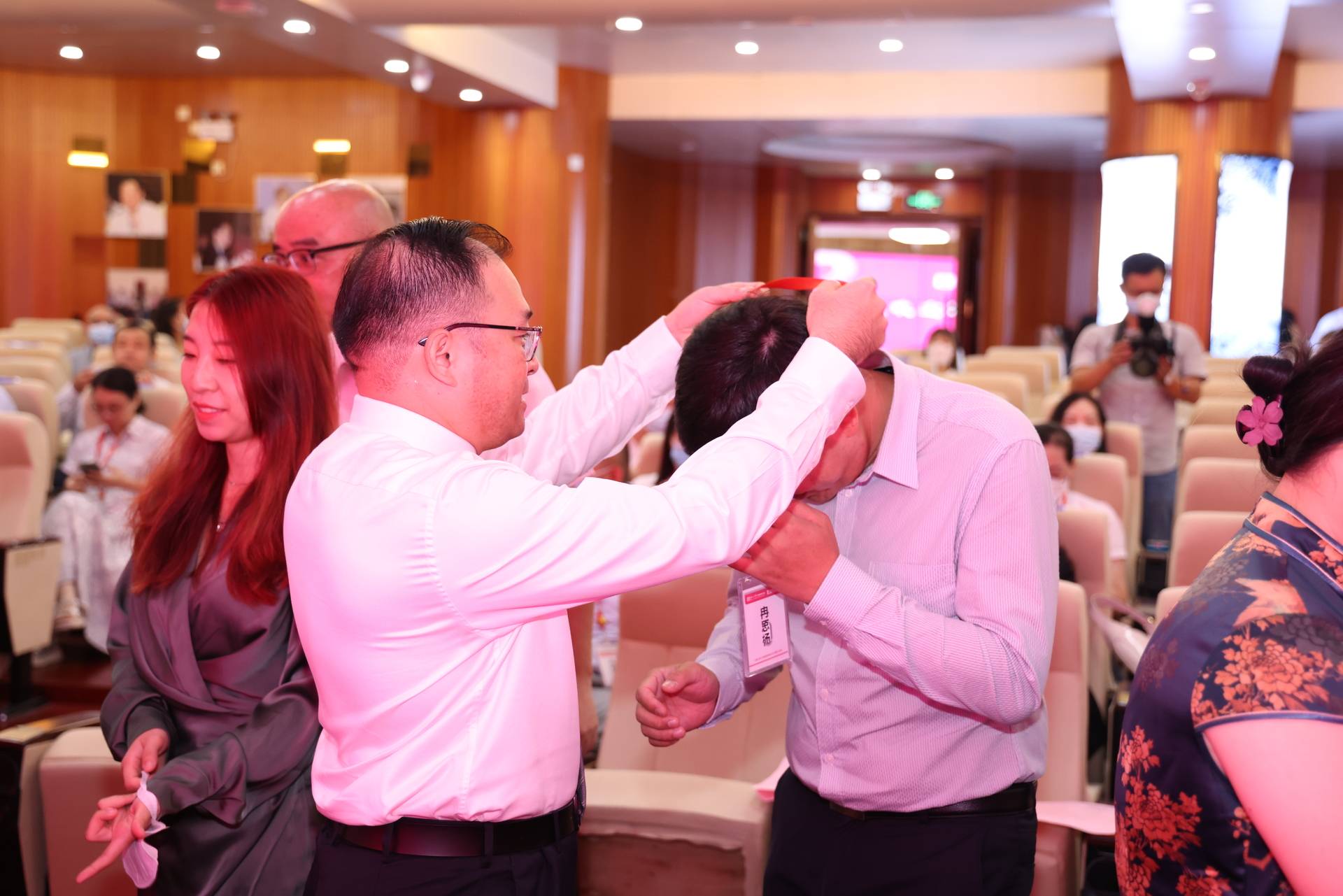 罗诚书记为EMBA新生佩戴广西大学EMBA学员证,赠送广西大学校徽