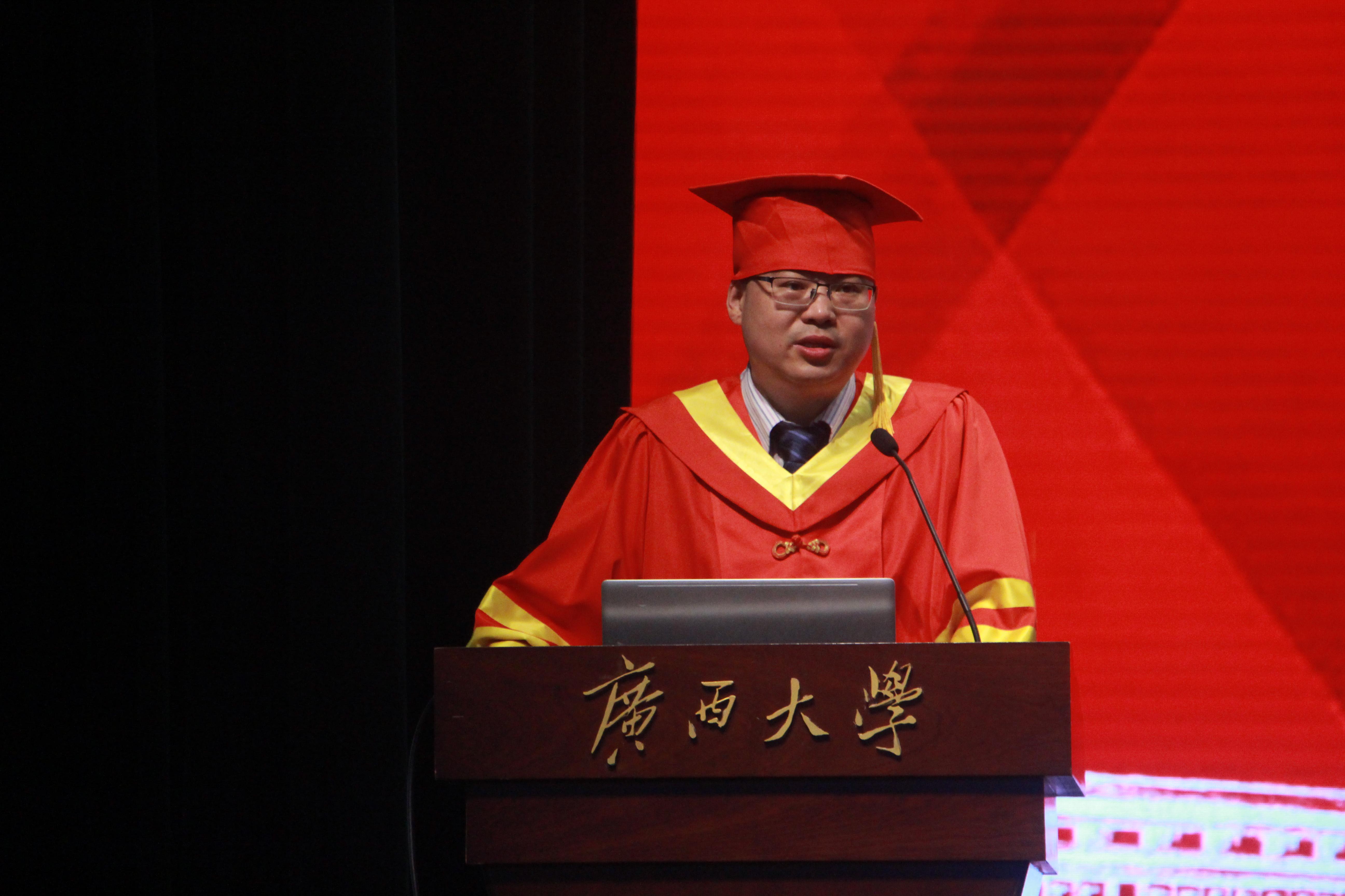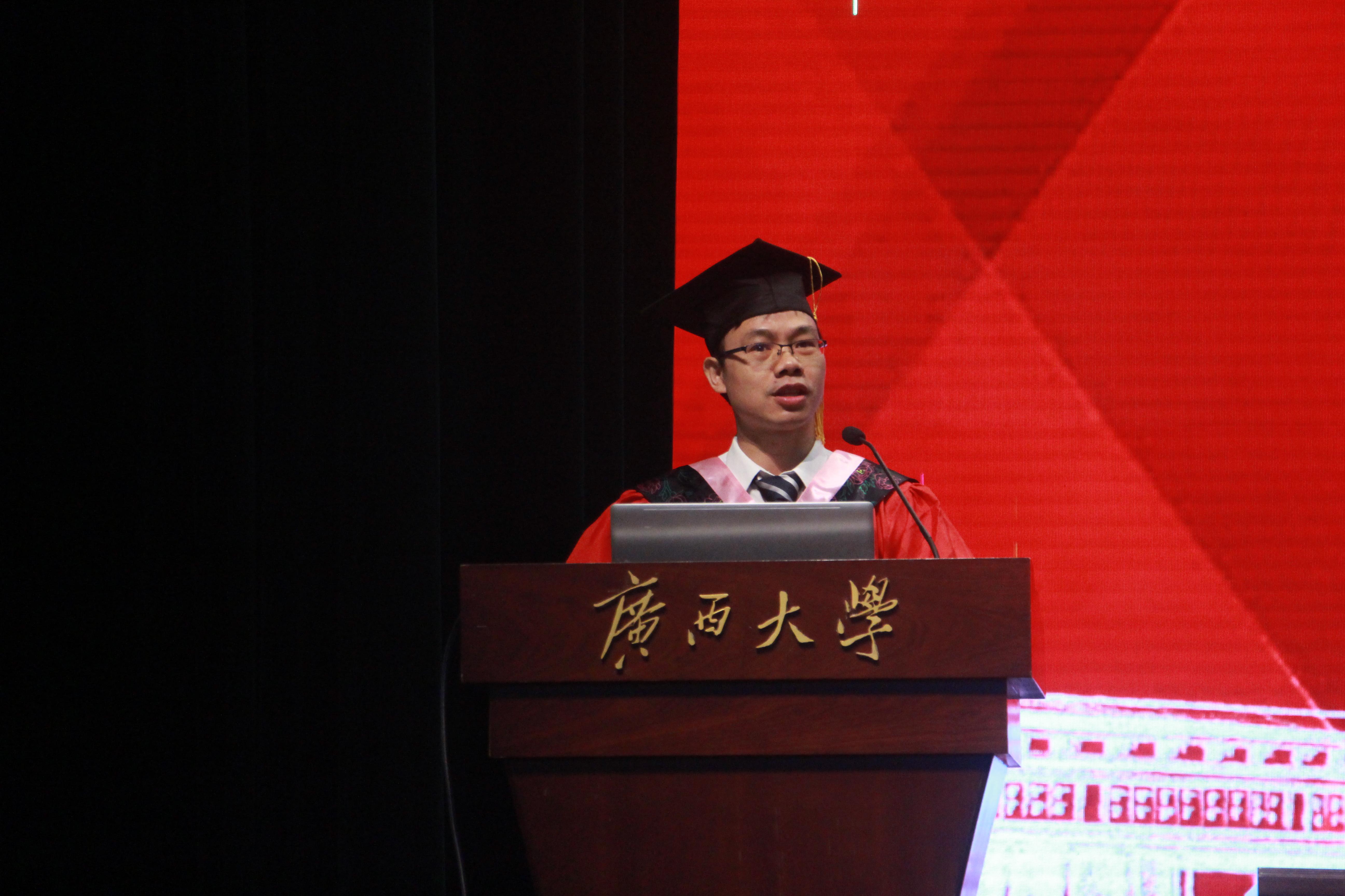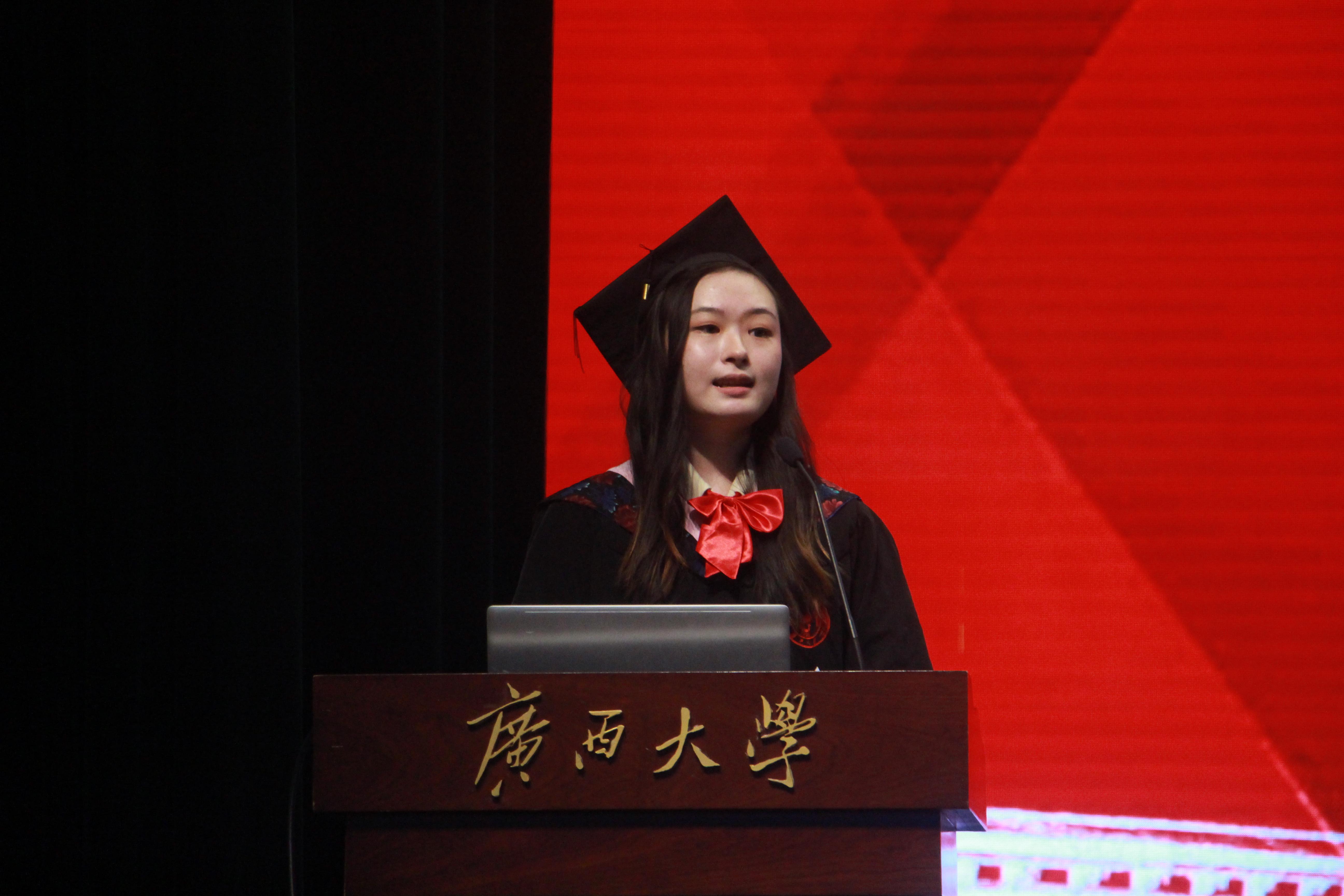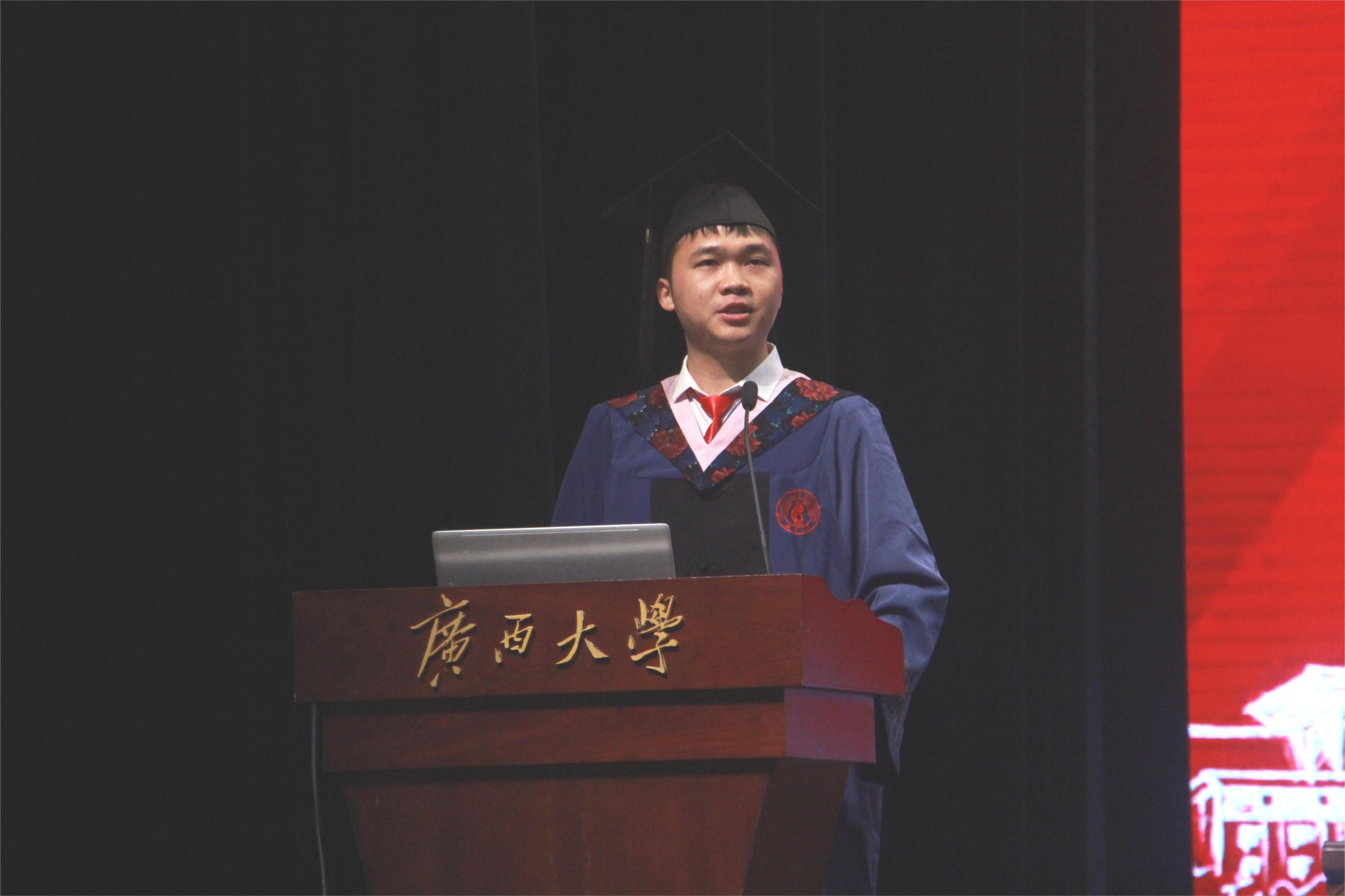 毕业研究生代表付晓同学谈到了进入广西大学的初心是“广西大学不仅教会我博采众长、挑战自我,更教会我勤恳朴诚、厚学致新的人生态度”。他表示,丰富多彩的研究生生活是一个熔炉,熔炼出每个人与众不同的个性和品格。他对学校、滨海湾金沙赌场