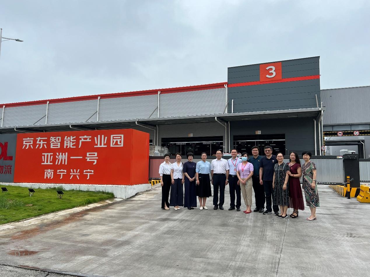 党委书记罗诚(左五)带队走访调研南宁京东“亚洲一号”智能产业园,京东集团区域公共事务总监、京东信成党支部书记张霓(左四)等热情接待