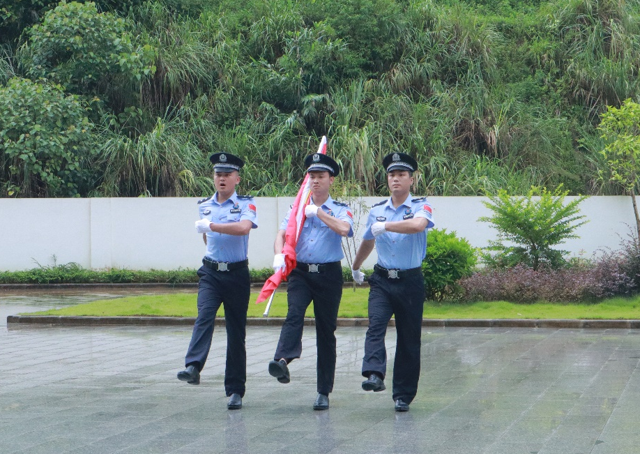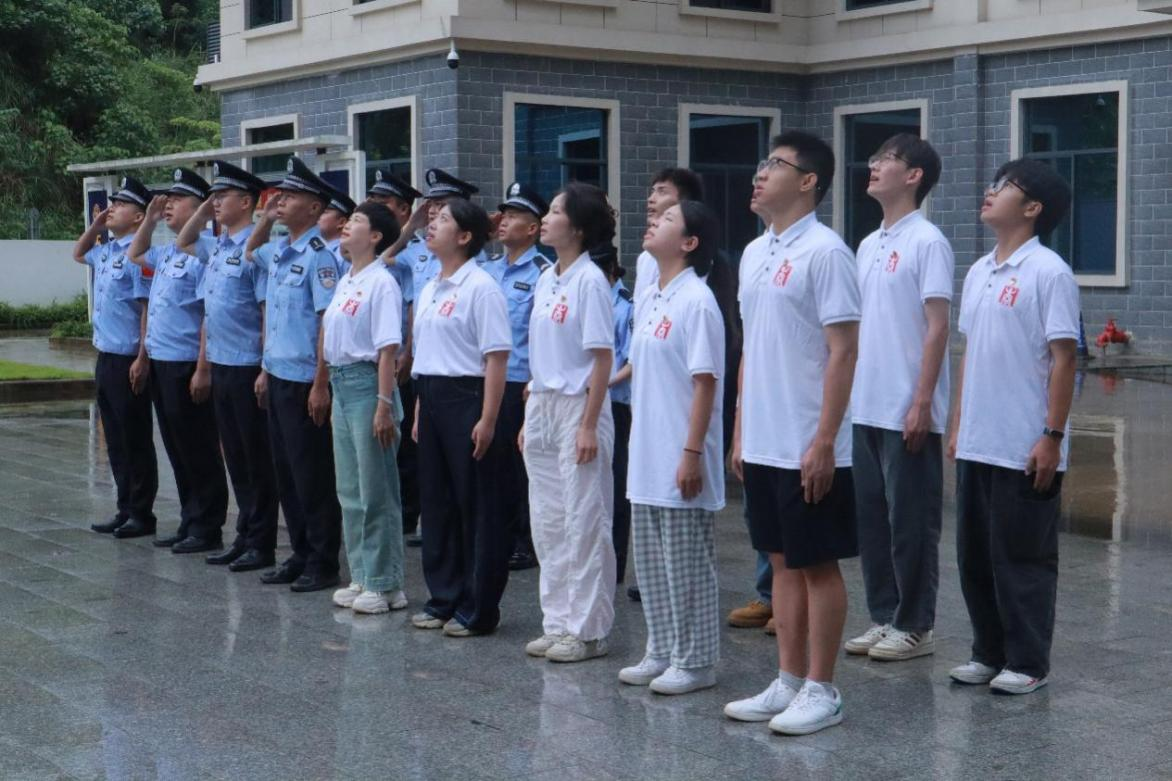 下雷边境检查站民警辅警与实践团成员举行升旗仪式