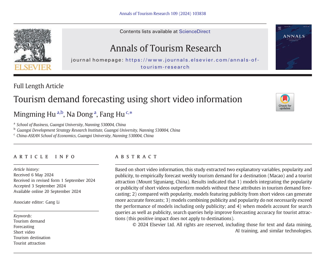 胡芳博士合作撰写的《Tourism Demand Forecasting Using Short Video Information》学术论文在旅游管理国际高水平期刊《Annals of Tourism Research》在线发表。《Annals of TourismResearch》是JCR分区Q1区期刊,中科院1区TOP期刊,ABS四星期刊,2023年影响因子为10.4。