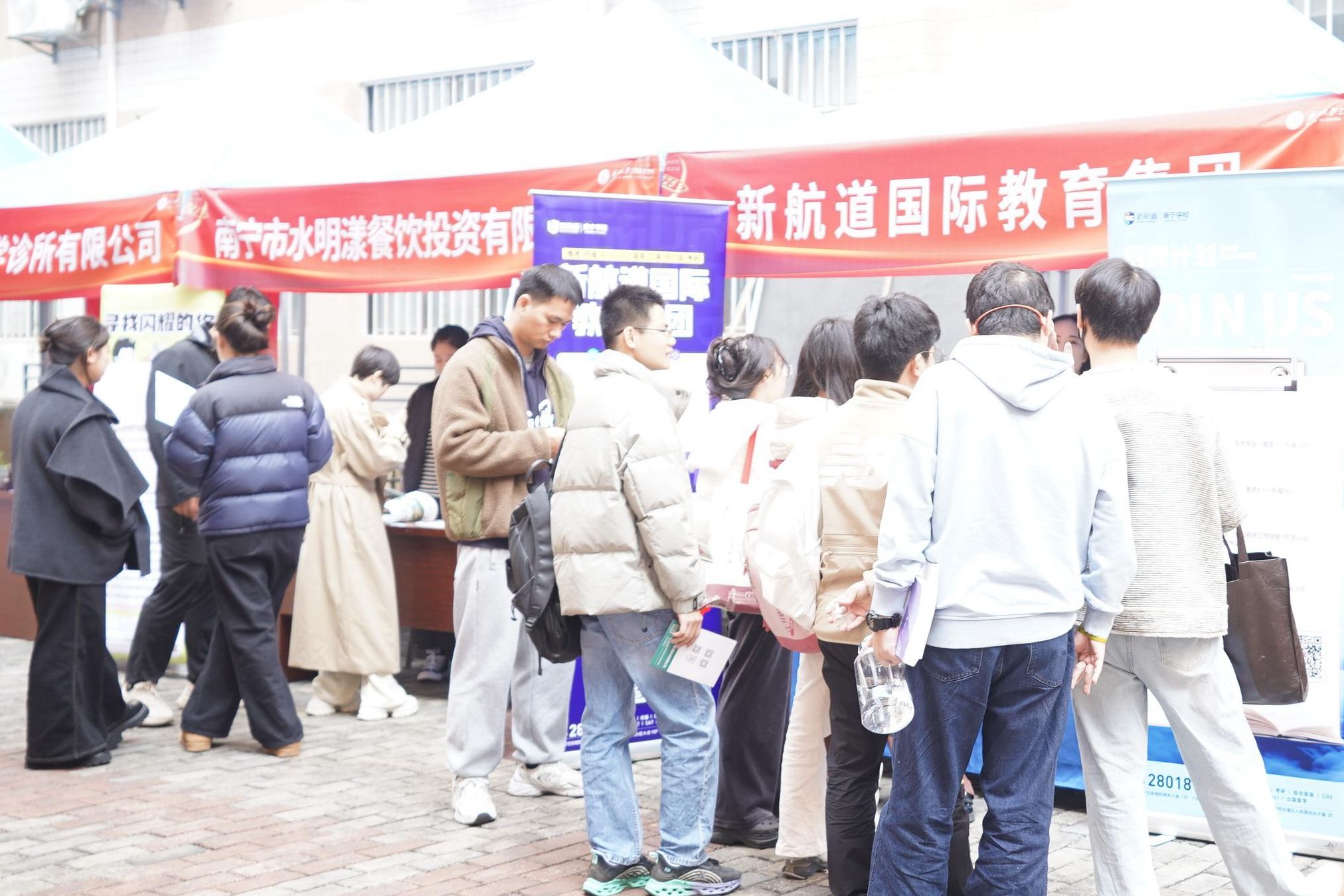 活动中,广西旅发文化旅游股份有限公司、中国邮政广西分公司等校友企业通过产品演示、文化分享,展现了行业前沿动态,如文创非遗产品体验、茉莉花奶茶品鉴等,拓宽了师生视野。三亩山农业发展有限公司、卫君睡眠医学诊所等企业带来了特色洗护用品、植物精油喷雾等健康产品,深受大家喜爱。新航道国际教育集团等教育机构则激发了学生职业规划的兴趣。此外,广西爱生多维长寿口腔科技有限公司、广西联祥显示智能科技有限公司、广西药膳食养协会、南宁市水明漾餐饮投资有限公司、广西龙云山茶业集团有限公司、南宁申科酒庄、忆千年酱香白酒、广西南宁持与茶文化有限公司、梧州市富谷六堡茶有限公司、广西君武行文化科技有限公司、西塘印象五星级茶馆等企业带来的高科技产品展示、特色产品展示、药膳养生讲解、茶艺文化体验等环节同样亮点纷呈。不少校友企业还为学生提供了多个就业岗位。