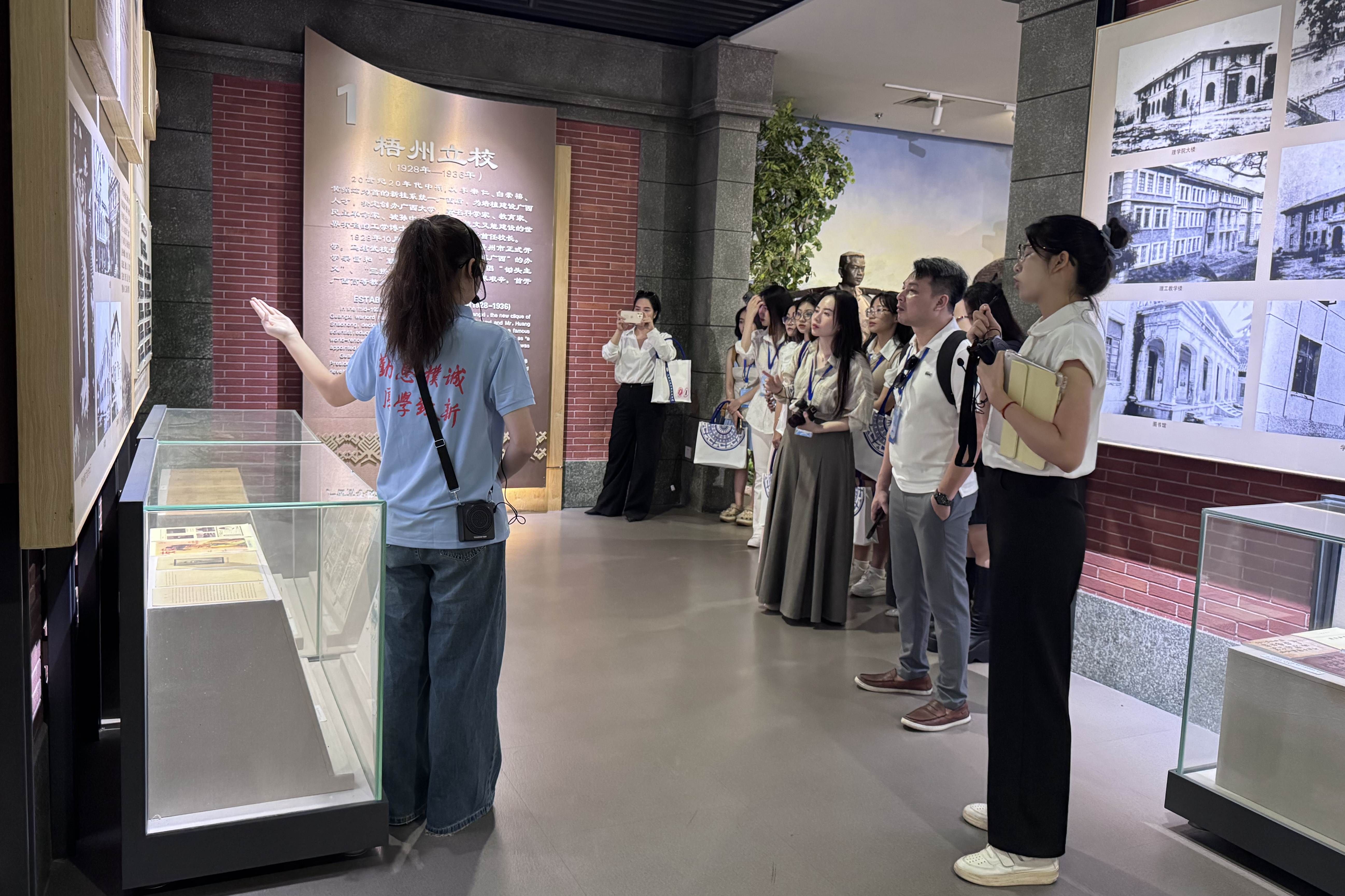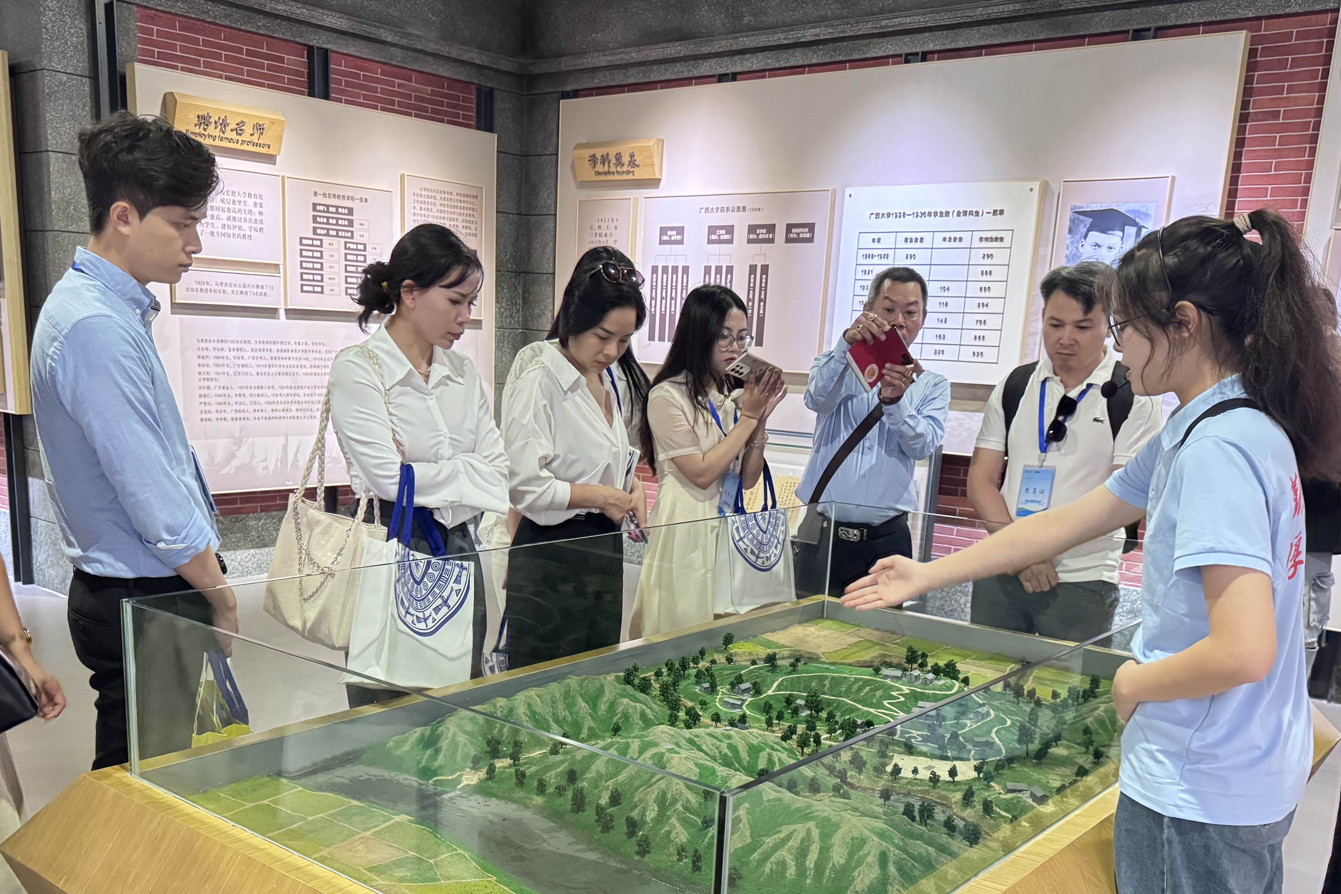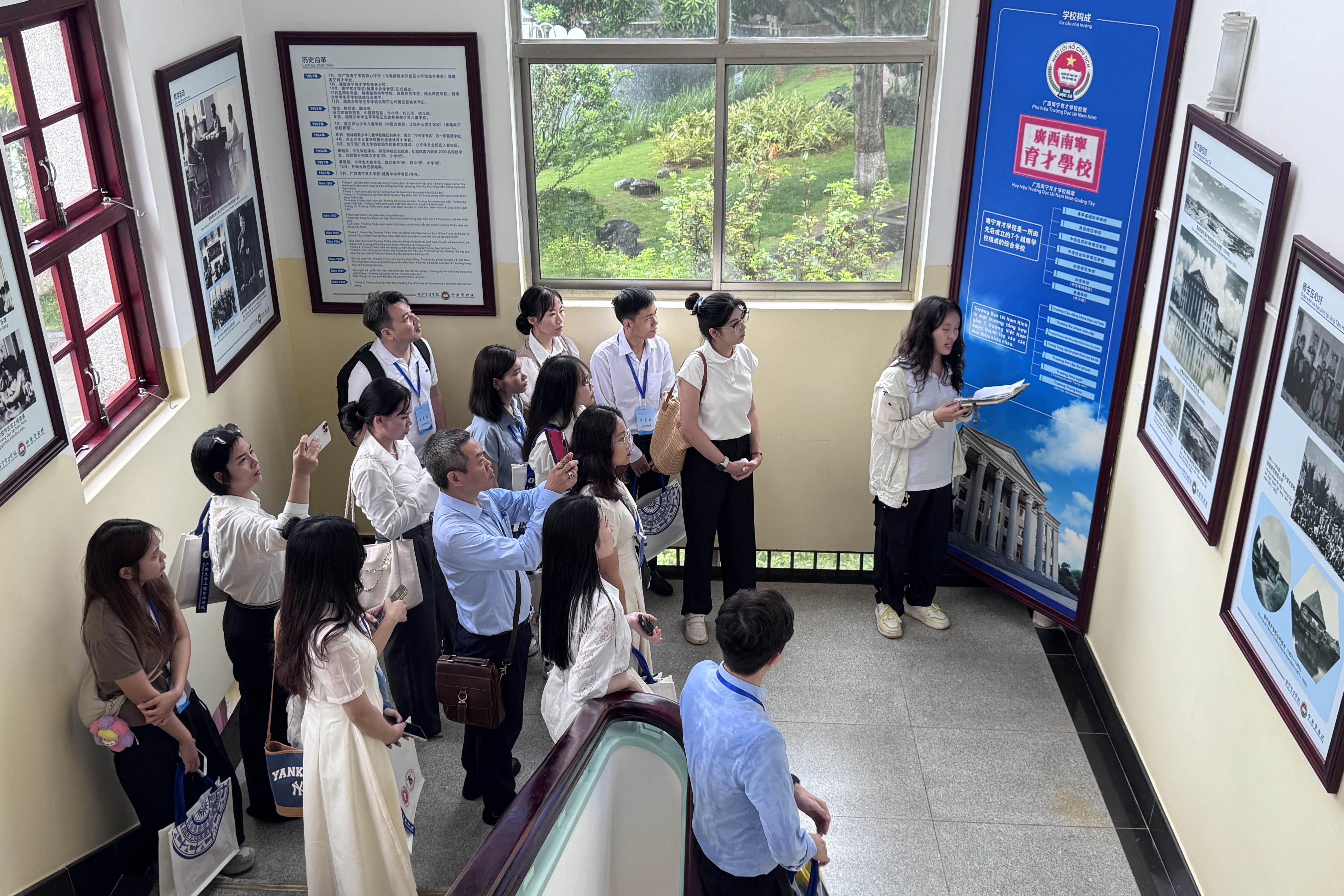 开营仪式后,越南师生参观了我校校史馆与育才学校旧址。据悉,本次夏令营为期8天,内容涵盖三大模块:课程学习聚焦中国-东盟数字经济合作、企业的商业模式创新、汉语基础课等;文化体验环节组织学员参观南宁民族博物馆,体验螺钿饰品制作、剪纸、油茶等非遗技艺;企业参访则安排学员走进广西泛航国际物流有限公司等企业,深度感知中国产业升级路径。