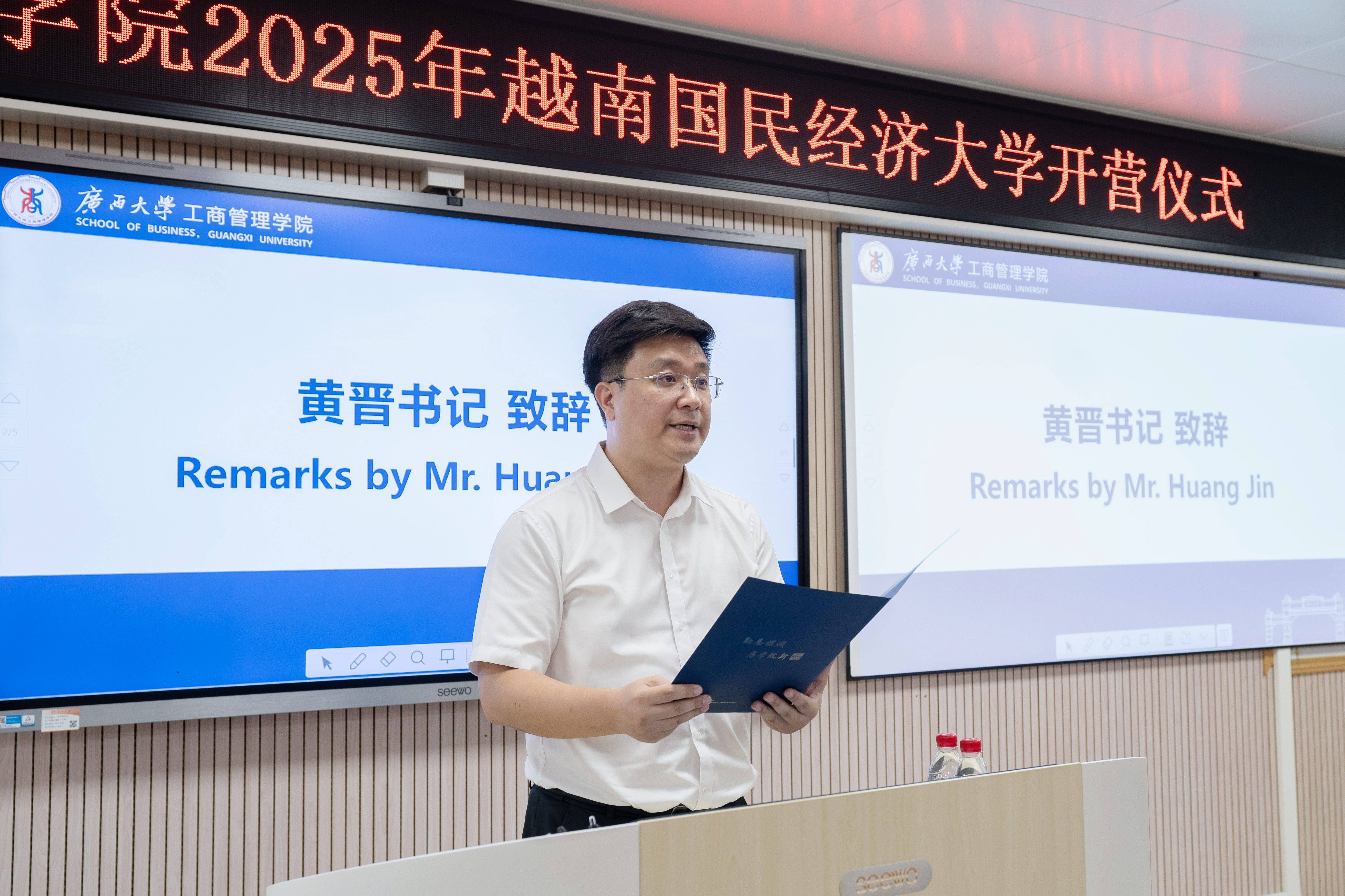 党委书记黄晋,越南国民经济大学教师代表阮仲青(Nguyễn Trọng Thanh)出席仪式。院长助理韦铁主持仪式,越南国民经济大学19名师生参加仪式。