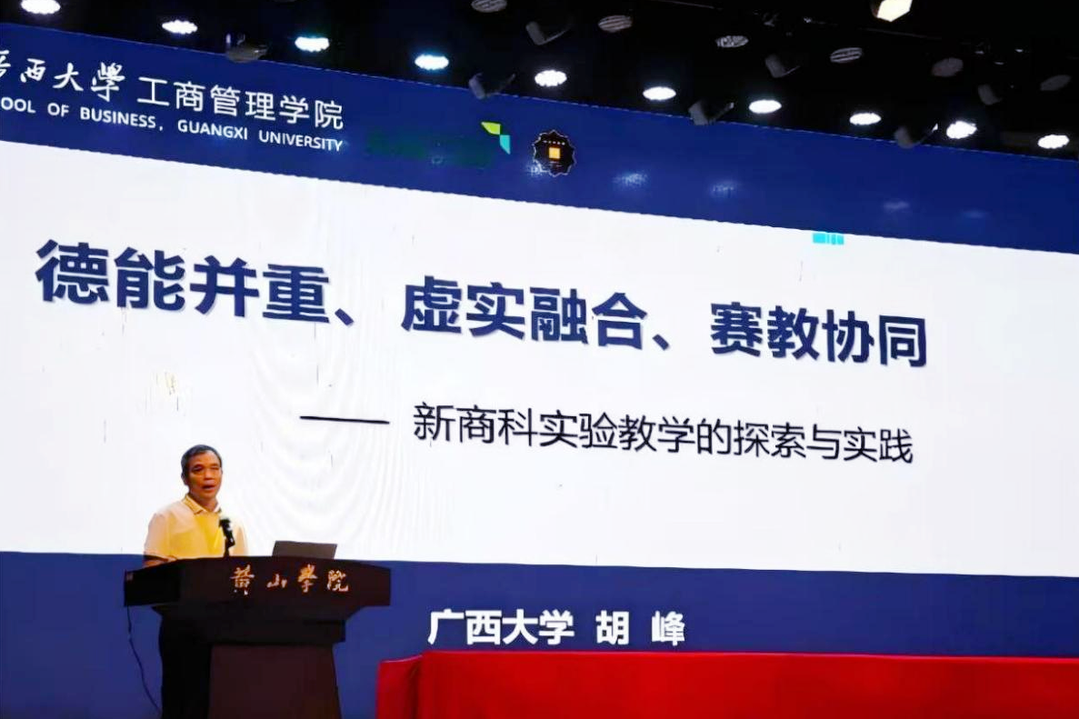 分管教学副院长申韬教授担任第一指导老师的“糖果超甜队”夺得全国总决赛亚军。申韬、胡峰、甘凌鸿等三位老师获“优秀指导教师”称号,广西大学获 “优秀组织单位”奖。企业管理系胡峰副教授应邀在会上作“德能并重、虚实融合、赛教协同——新商科实验教学的探索与实践”主题报告。