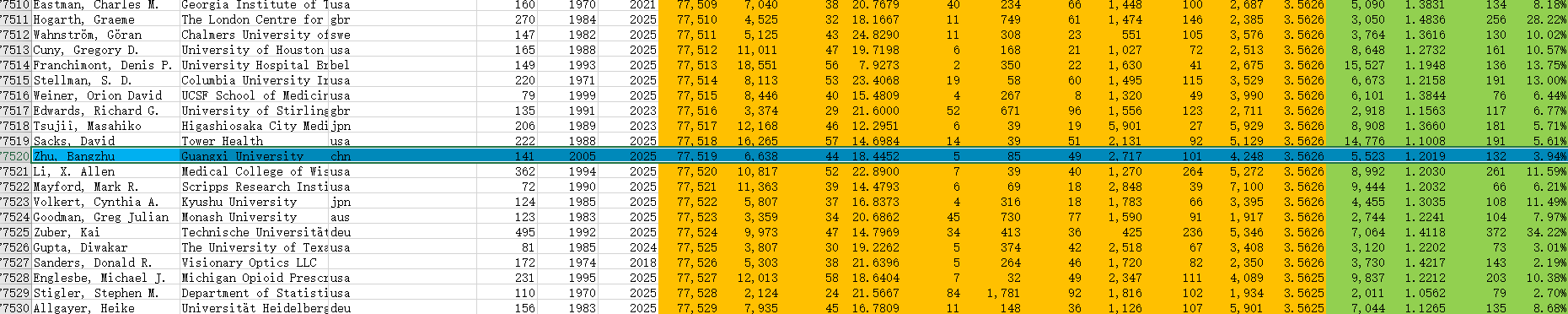 全球前2%顶尖科学家榜单是基于Scopus数据库的引用数据系统分析,使用总引用量(区分自引和他引,提供自引数据)、HirschH-index、共同作者修正的Schreiber Hm-index、单独作者、单独或者第一作者等6个关键因素进行综合评估,从全球近700万名科学家中遴选出世界排名前2%的科学家。榜单分为22个主要领域和174个子领域,通过“生涯影响力”和“年度影响力”两个维度反映科学家的影响力和科研成就,旨在为科学家的长期科研表现提供一个客观且真实的衡量指标。该榜单自发布以来受到学术界的高度关注,被视为全球范围内具有广泛影响力和公信力的权威榜单。
