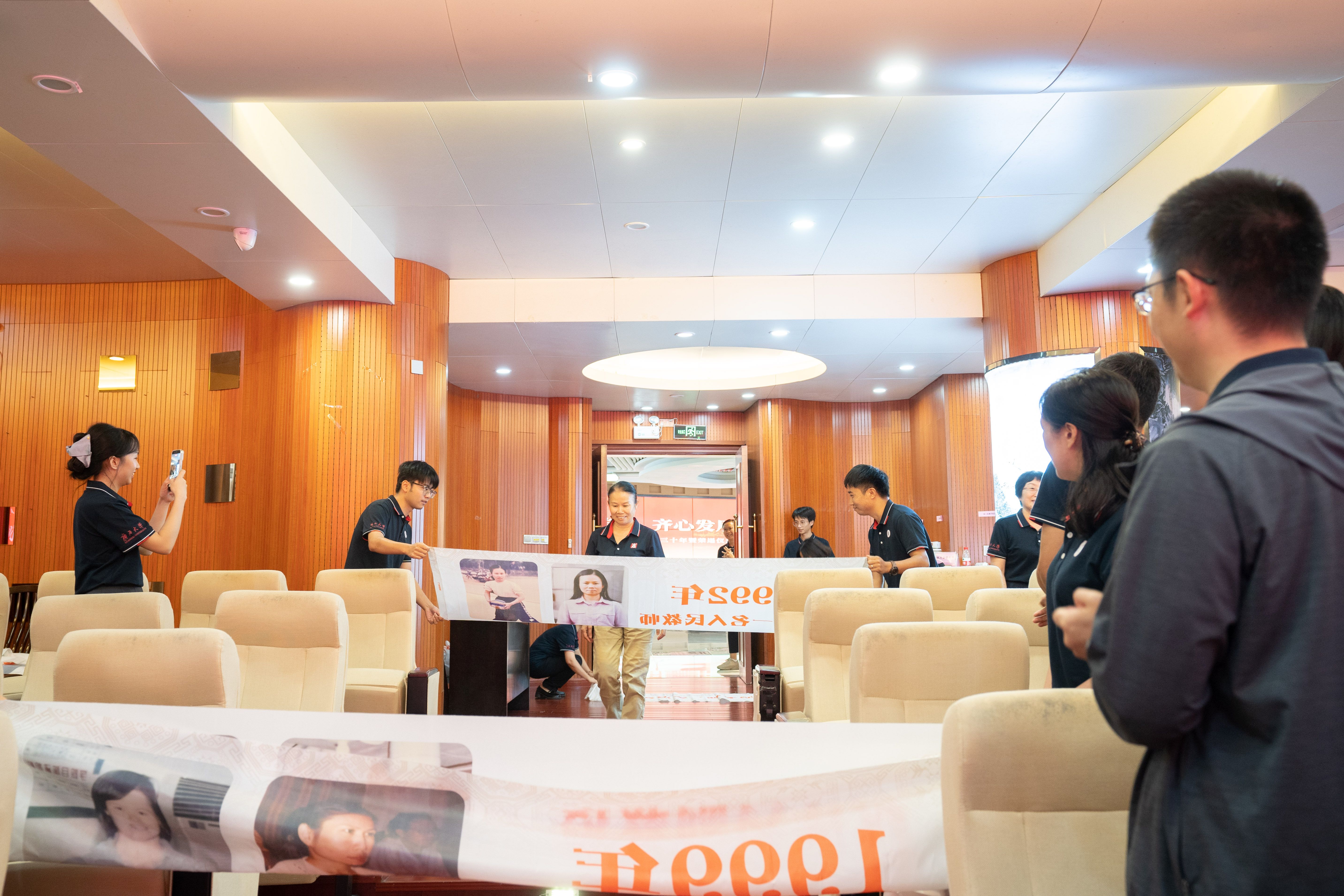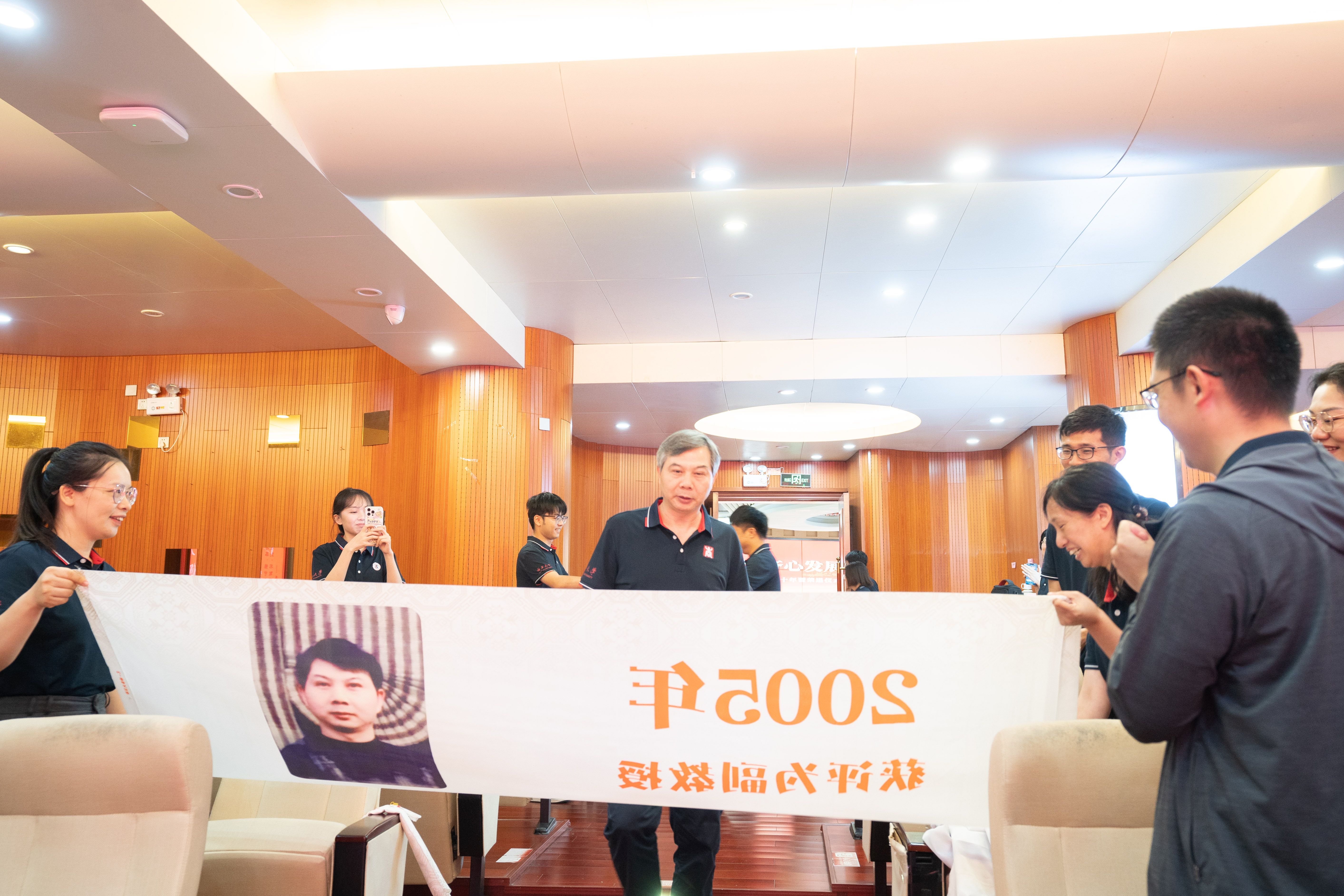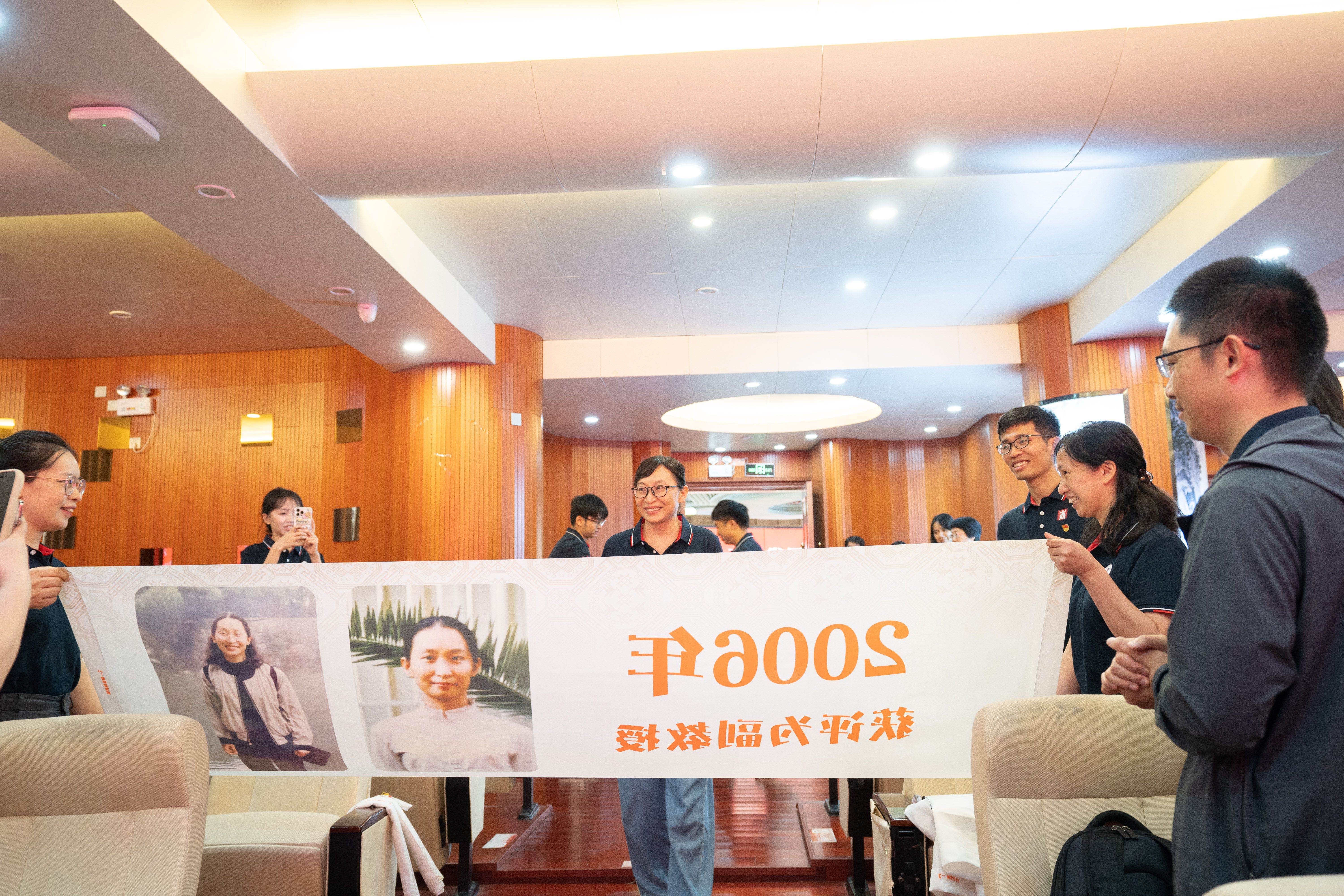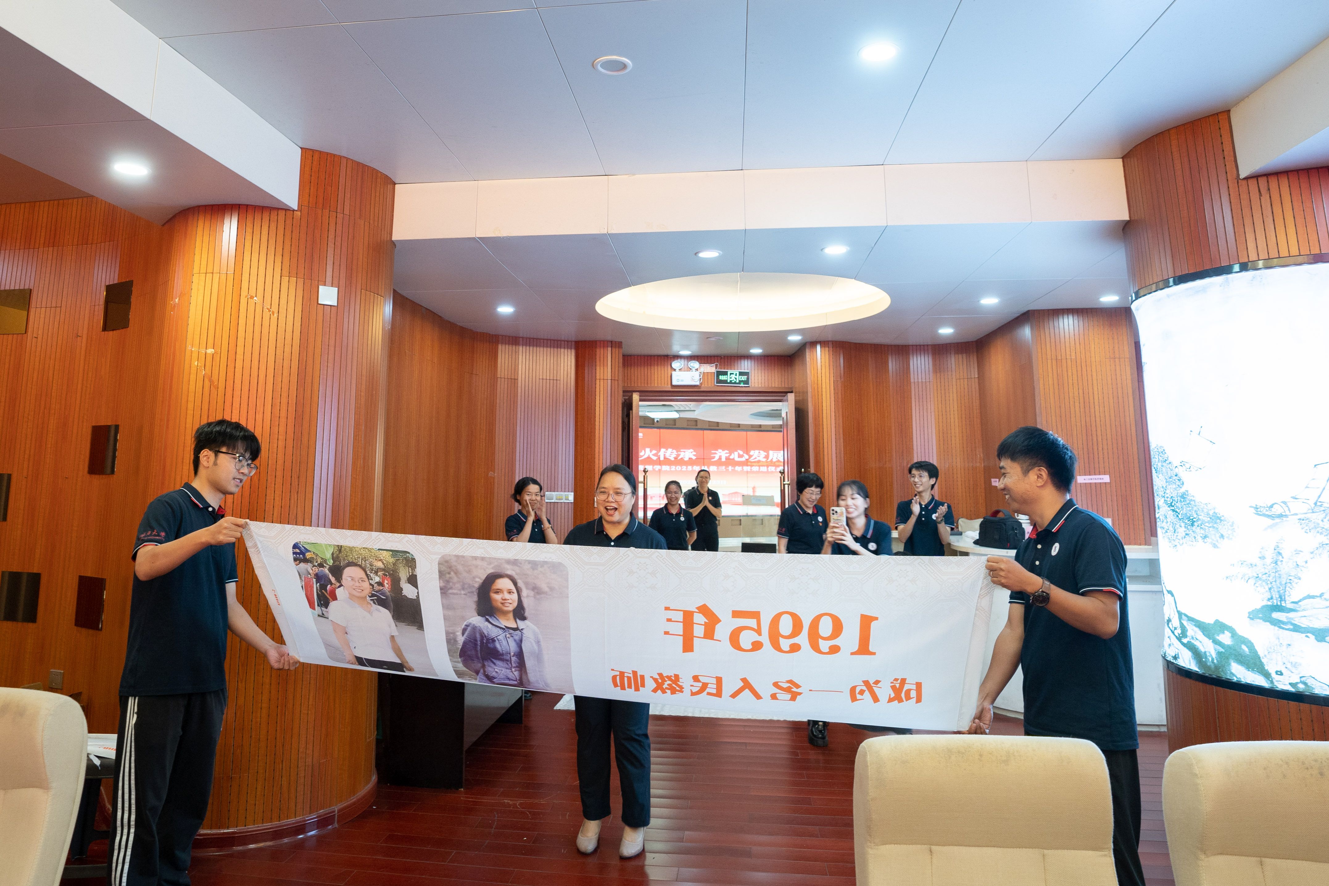 精心设计的五组纪念横幅沿通道徐徐展开,每幅横幅以时间轴形式呈现他们职业生涯的关键节点:从初登讲台的青涩岁月,到获评职称的重要时刻;从一名普通教师的平凡瞬间,到独当一面的专业负责人……这些珍贵的画面在横幅上一一展现,勾勒出最动人的“奉献长卷”,让在场的每一个人都能深刻感受到他们从教多年的坚守与付出。五位老师看着横幅上的自己,眼中闪烁着泪光,那是回忆的光芒,也是对教育事业深厚情感的流露。