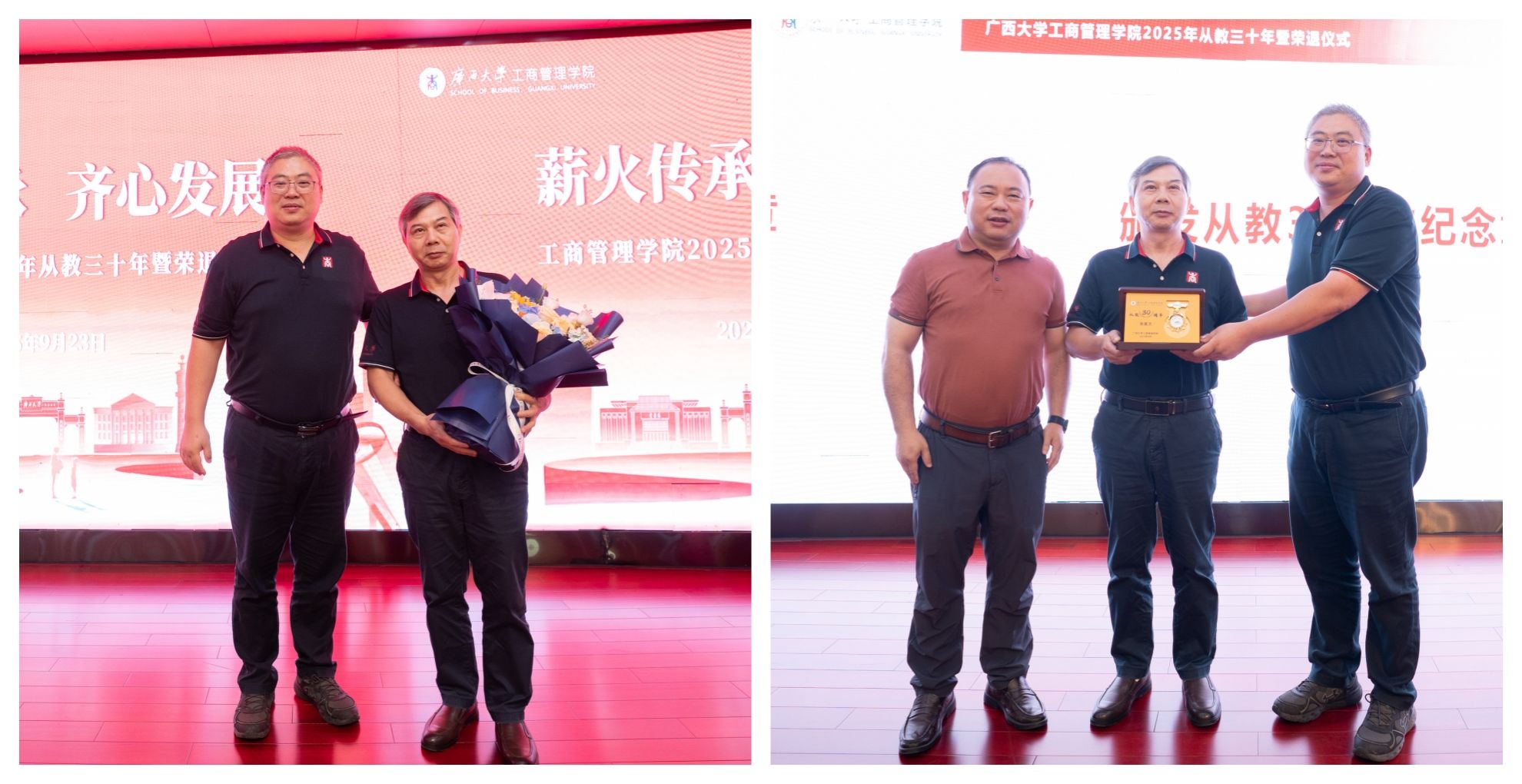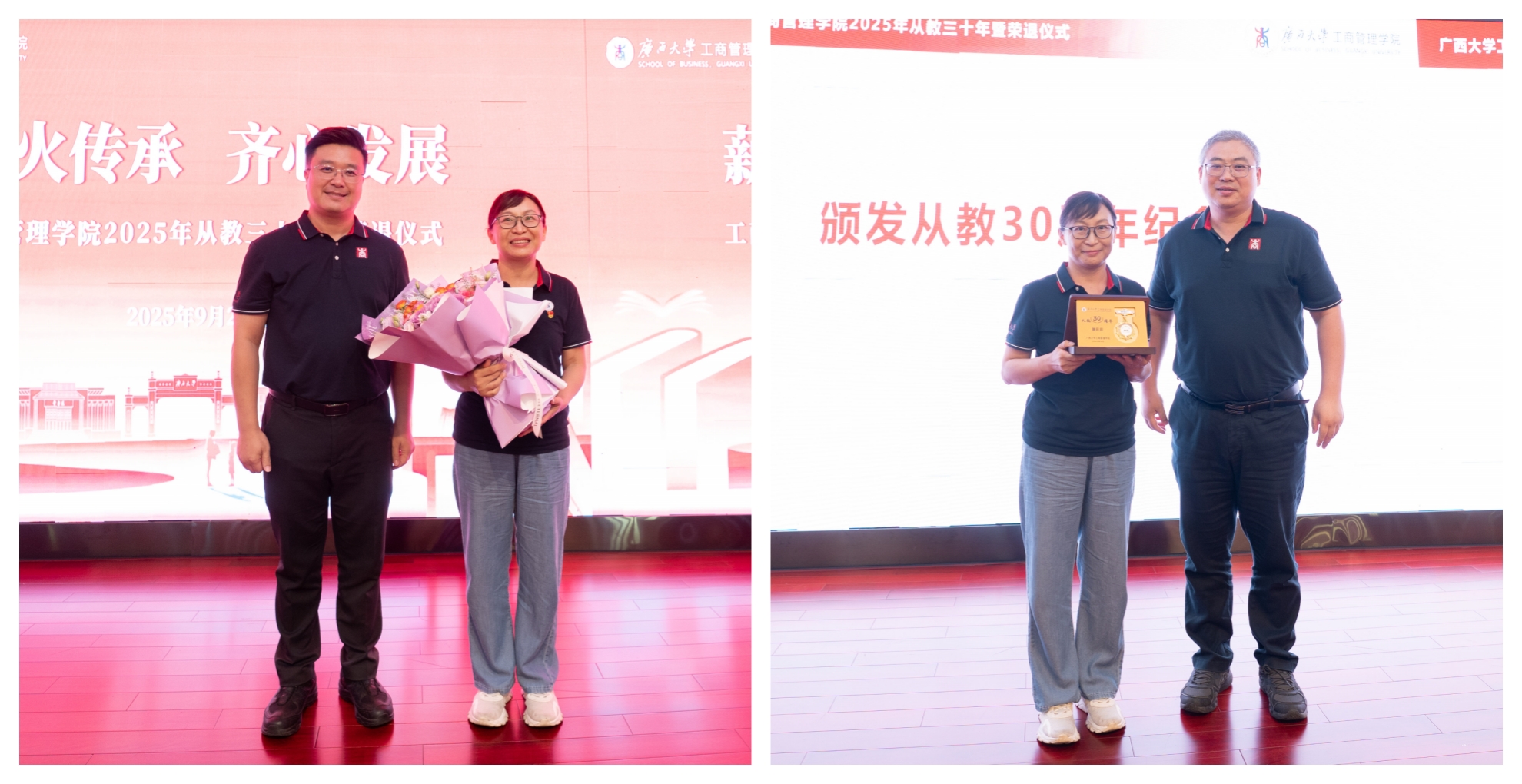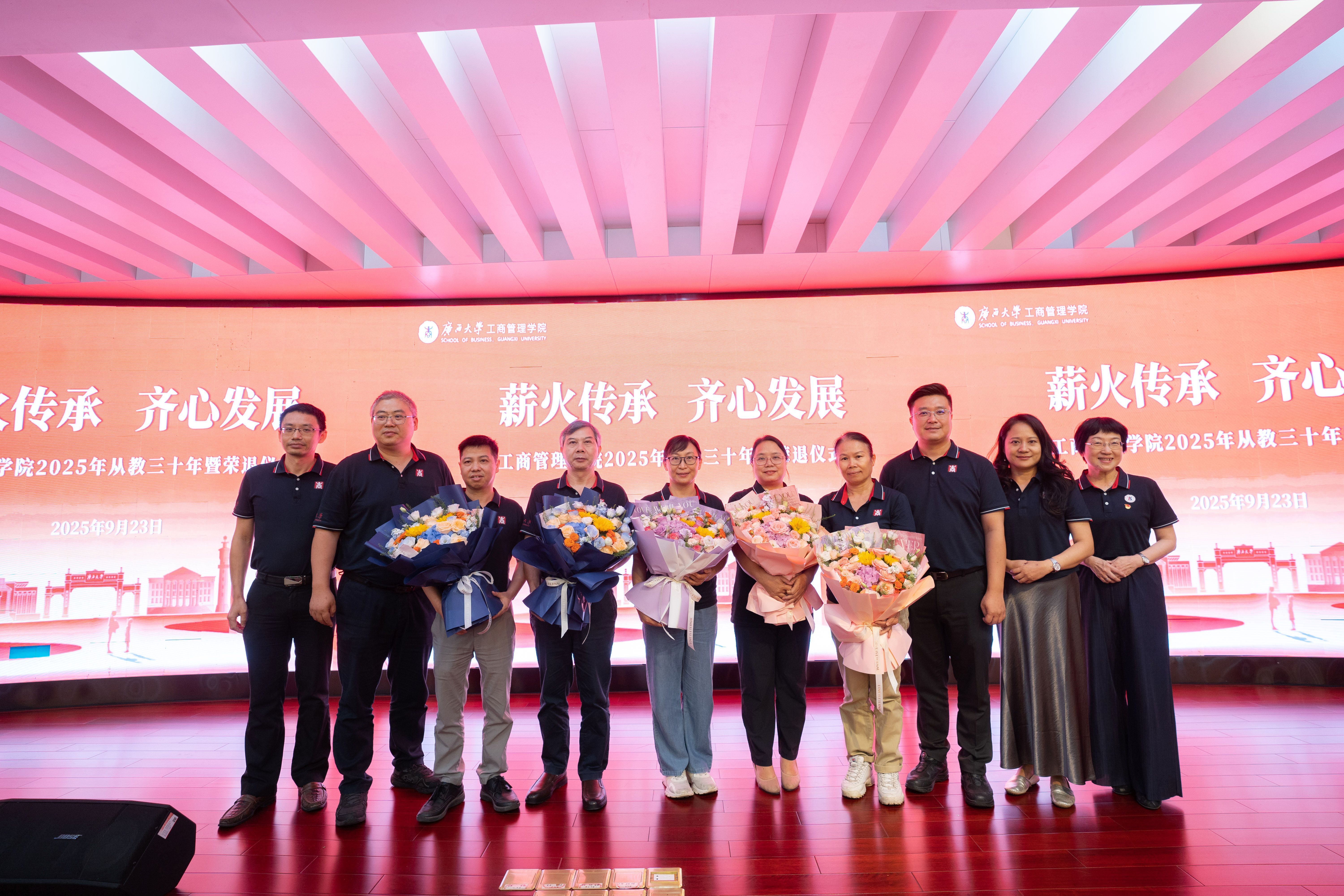 党委书记黄晋、院长朱帮助,党委副书记肖克宁,副院长朱少英、申韬、廖东红、韦铁,学校科研平台建设管理处副处长刘民坤与全院教职工欢聚一堂,举行2025年从教三十年暨荣退仪式,向五位教育工作者致以崇高敬意。