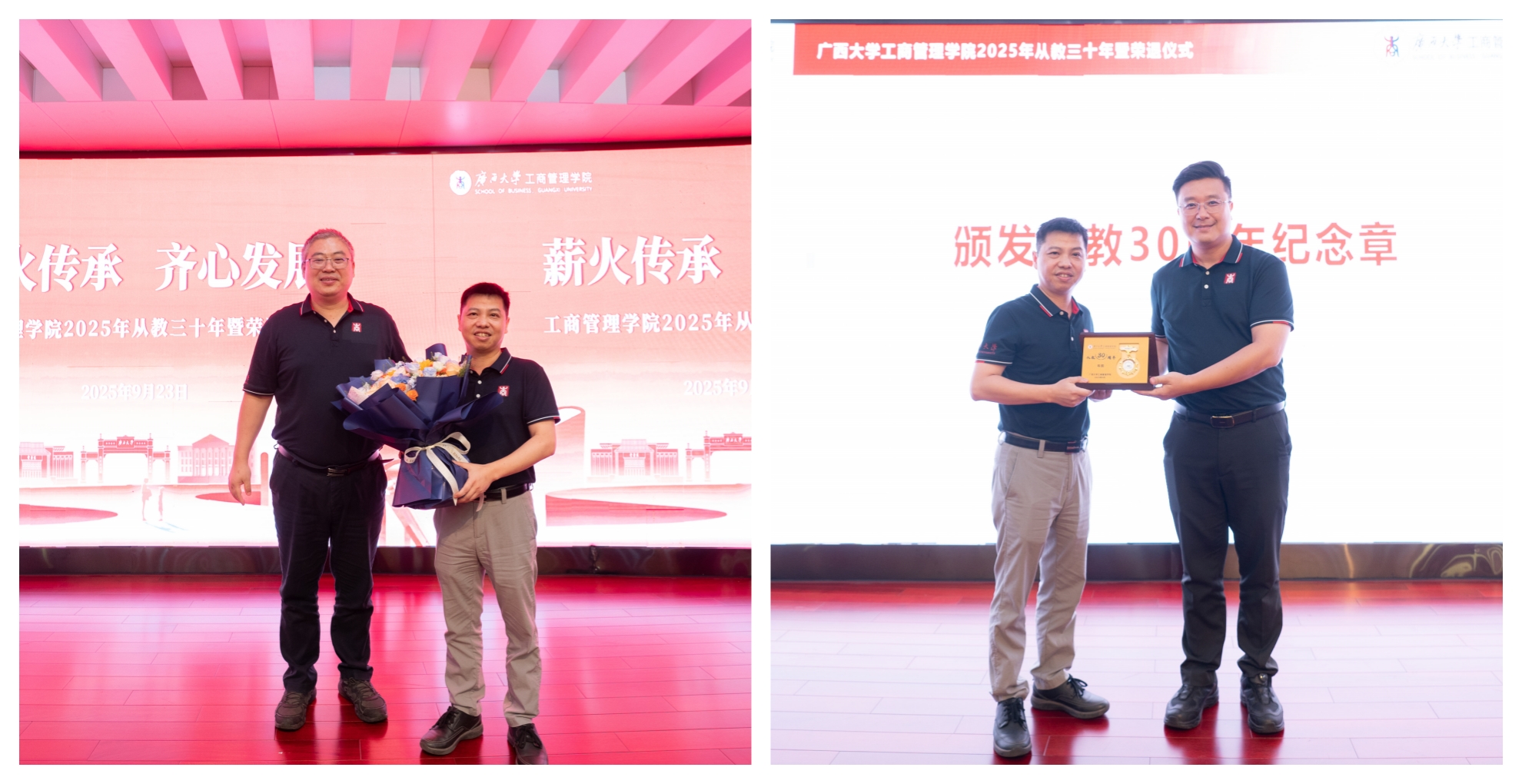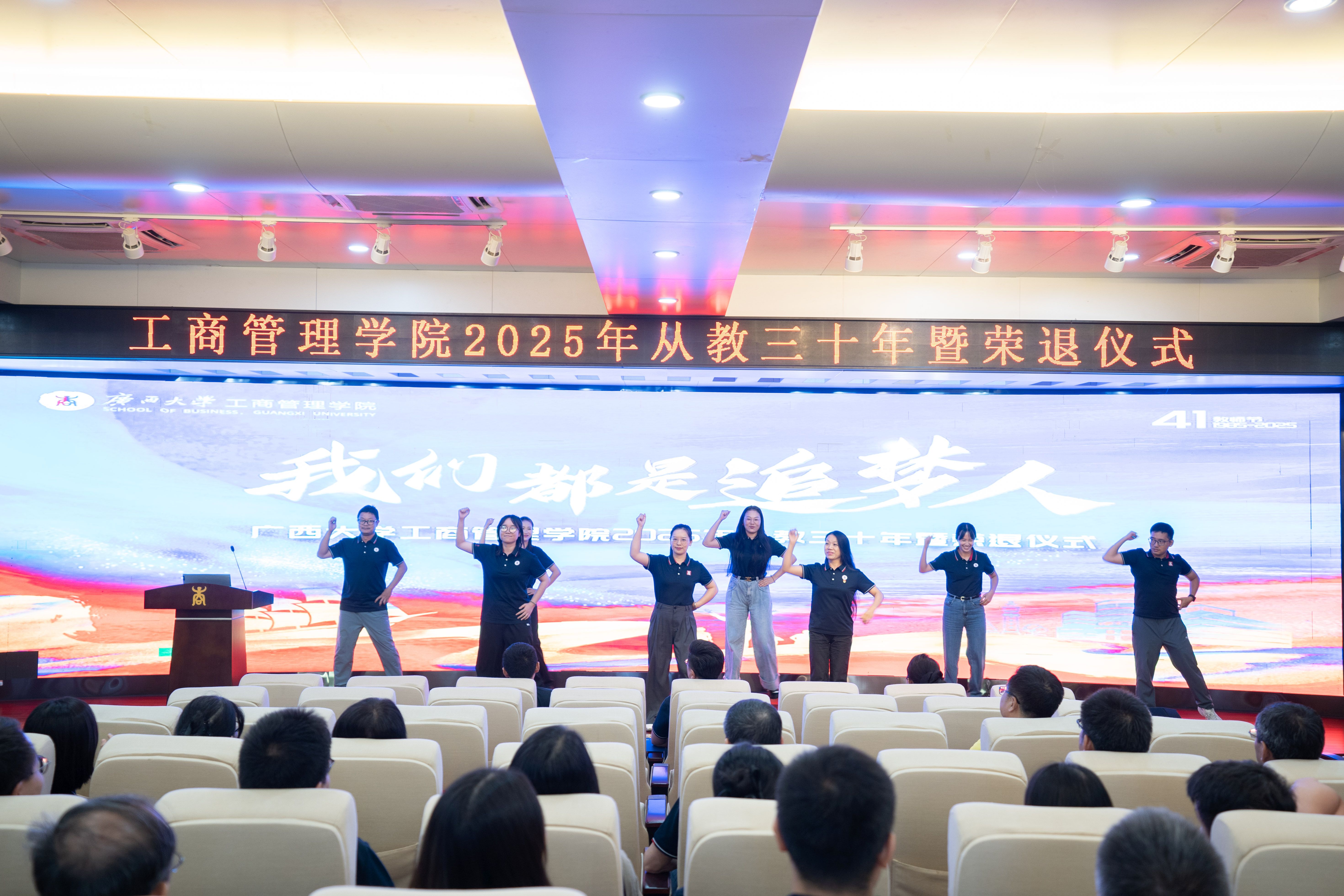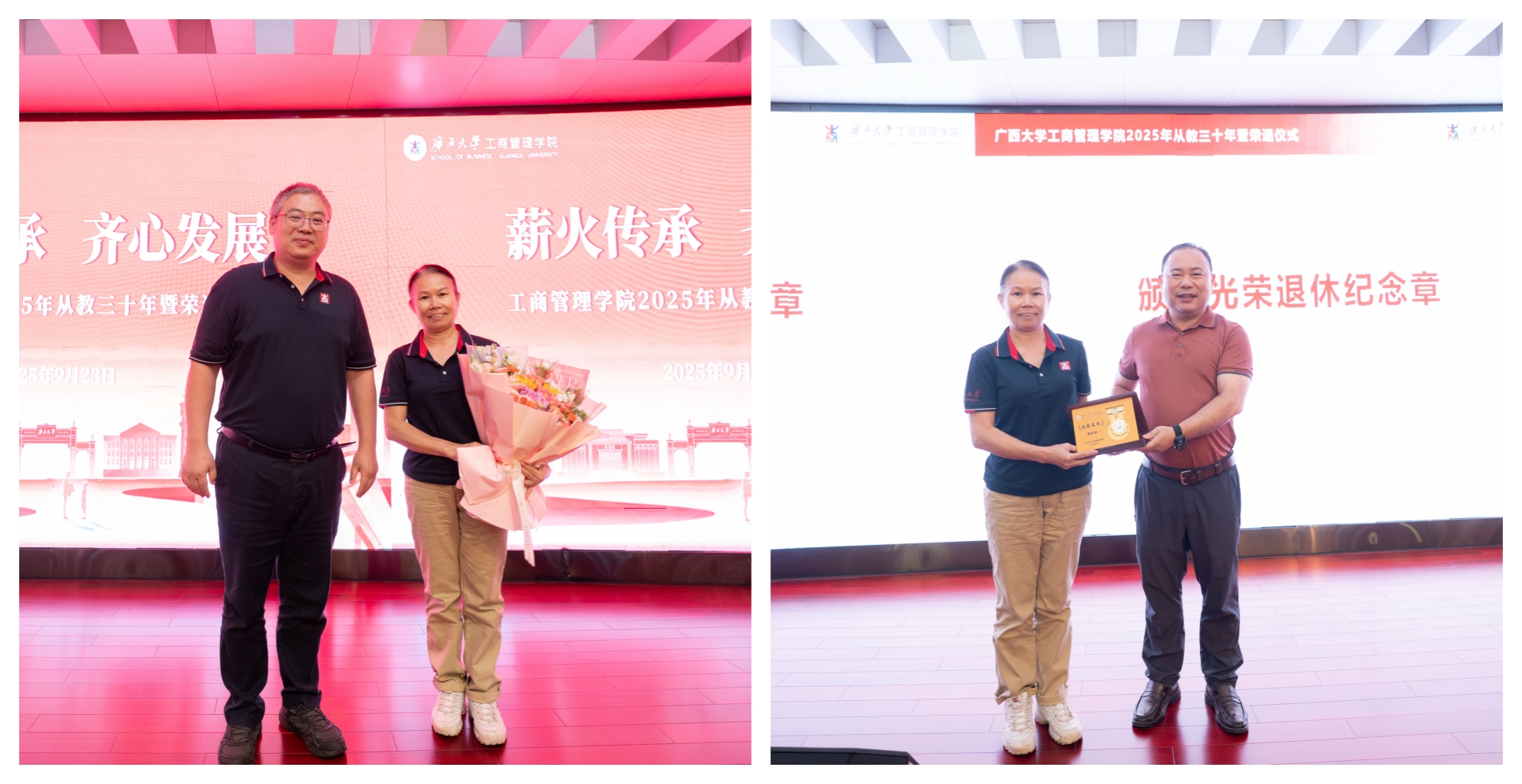 党委书记黄晋、院长朱帮助,党委副书记肖克宁,副院长朱少英、申韬、廖东红、韦铁,学校科研平台建设管理处副处长刘民坤与全院教职工欢聚一堂,举行2025年从教三十年暨荣退仪式,向五位教育工作者致以崇高敬意。