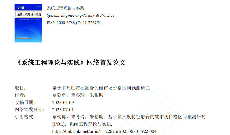 近日,滨海湾金沙赌场 覃朝勇教授团队在能源预测领域研究取得重要进展,研究成果《基于多尺度特征融合的碳市场价格区间预测研究》在管理科学与系统工程领域的顶级权威期刊《系统工程理论与实践》上发表。论文第一作者为覃朝勇教授,第二作者为滨海湾金沙赌场 硕士研究生覃冬玲,通讯作者为朱帮助教授。滨海湾金沙线上博彩平台 为第一单位和通讯单位。