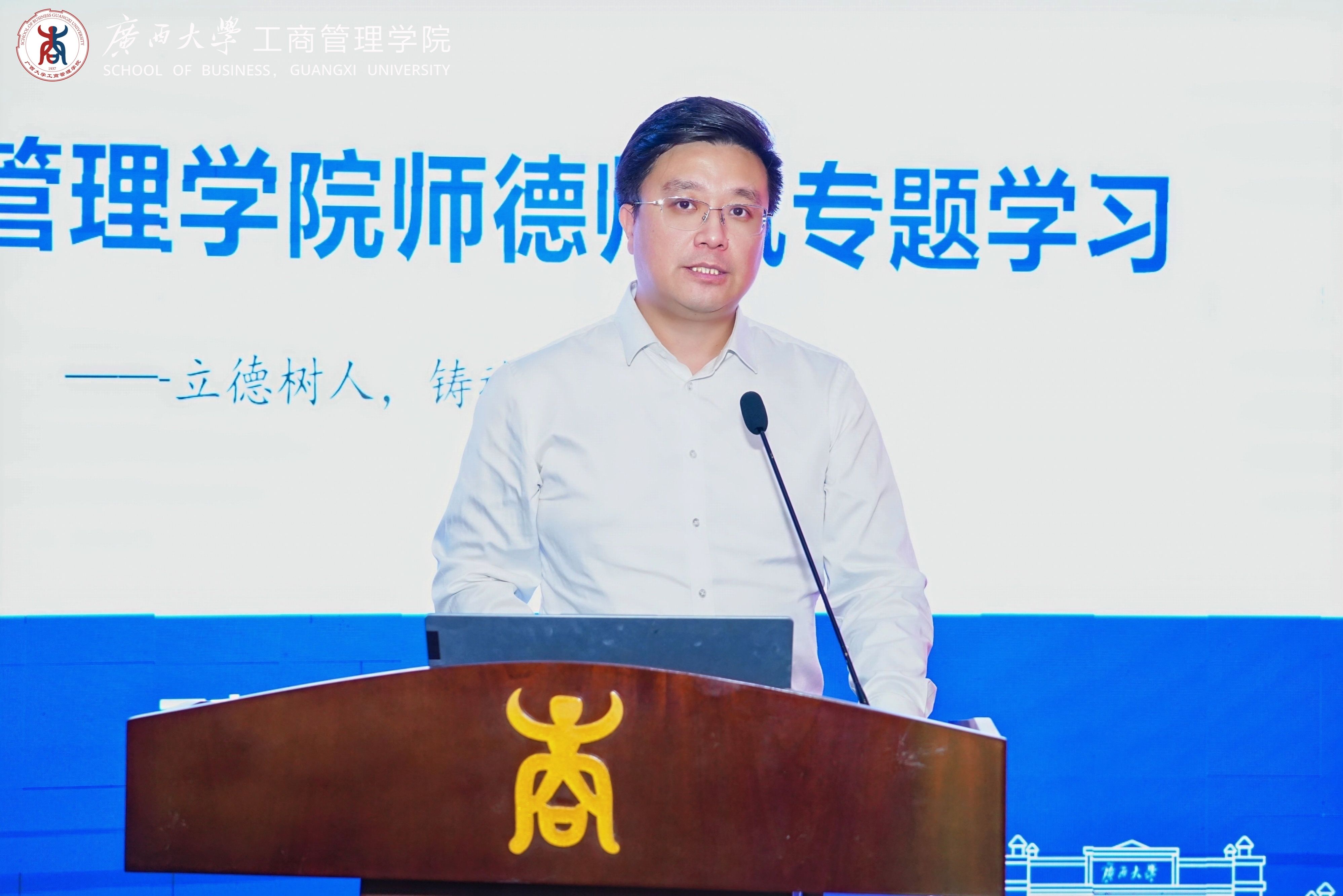 研究生教育工作的大力支持表示感谢。随后,他组织大家学习领会习近平总书记关于教育的重要讲话精神、研究生导师指导行为准则、校外行业合作导师职责、广西大学教师师德负面清单,并进行了师德警示教育。他强调,良好的师德师风是教育事业的基石,对于培养德才兼备的专业硕士至关重要。导师们不仅要在专业知识和实践技能上给予学生指导,更要在品德修养和职业操守方面为学生树立榜样。