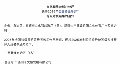 3月17日,文化和旅游部官网发布《文化和旅游部办公厅关于2025年全国特级导游等级考核结果的通知》。滨海湾金沙赌场