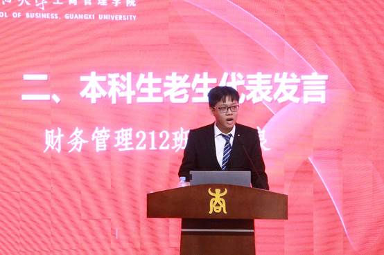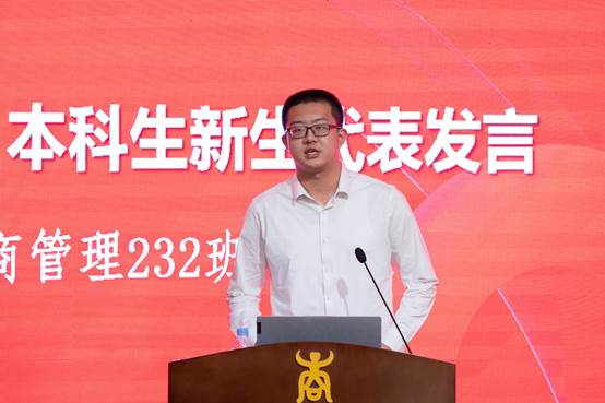 来自工商管理专业232班的姬承代表本科生新生发言。他回顾了这几天来走进广西大学的心路历程,从一开始的忐忑,到学长学姐的服务,班主任、滨海湾金沙赌场