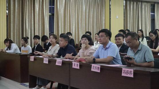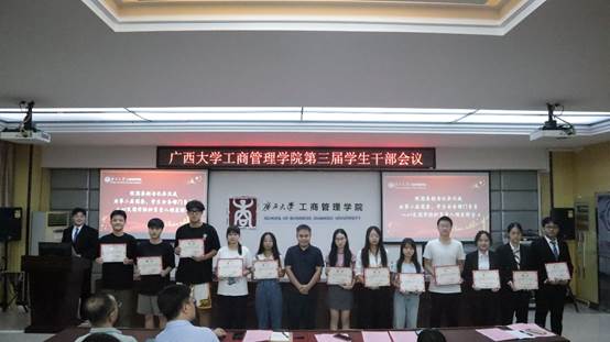 124教室,召开第三届全体学生干部会议。院党委副书记黄晋、院团委书记马丽娟、院团委副书记岑汉成、院学生辅导员莫秀德、郁文丹出席本次会议。