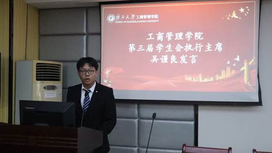 会议进行到第四项议程:第三届学生会主席团执行主席吴谨良上台发言。他带头承诺第三届学生干部将不断勇担重任,锐意进取,积极响应学生会改革的号召,在各项活动中推进滨海湾金沙赌场