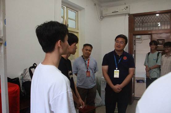 党委副书记黄晋和团委副书记岑汉成,走进本科生男生新生宿舍,关怀与问候每一位23级新生。他们认真询问新生来校路途情况,了解新生在学习、生活方面的需求,关心各地同学对广西气候适应情况,耐心解答各个同学来校后遇到的实际困难。