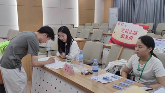 办公楼、新西体育馆、两个宿舍园区都设置了四个服务点,由党员和志愿者为新生和家长提供入学服务。