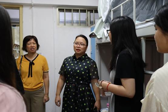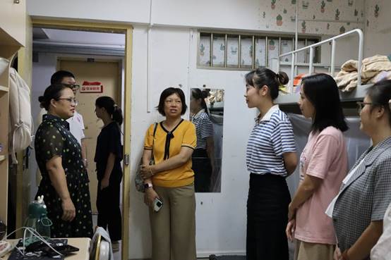 副院长朱少英、研究生管理中心主任叶映、年级辅导员张艳红以及新生班主任等领导老师前往2023级研究生新生宿舍进行走访,向新生们致以热情的欢迎和亲切的问候。她们询问新生们在生活方面的适应情况以及遇到的困难和问题等,并耐心解答学生们提出的各种问题,深切叮嘱了同学们注意寝室用电安全,注重维护整洁的寝室环境,合理调整好自己的心理状态和生活节奏,及早做好学术科研上的规划,为刚进校园的学生们送去了温情的关怀。