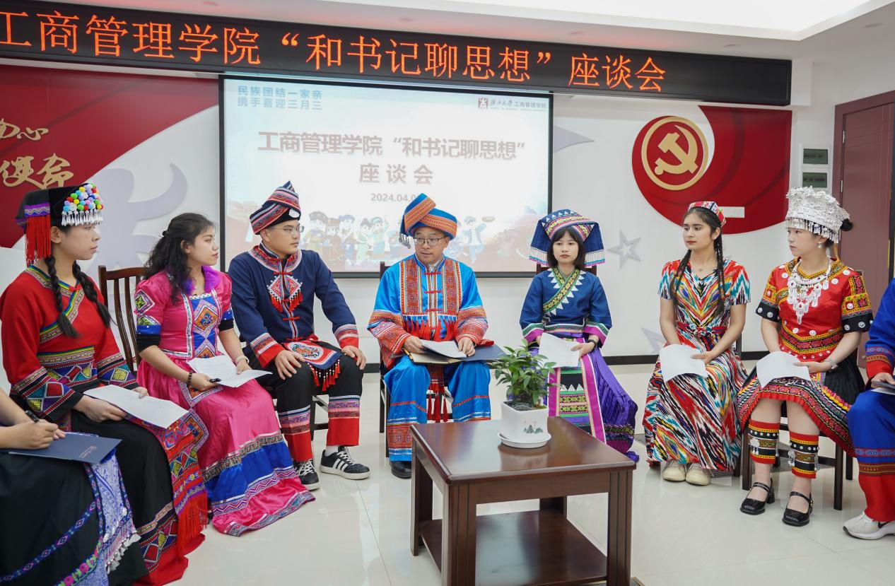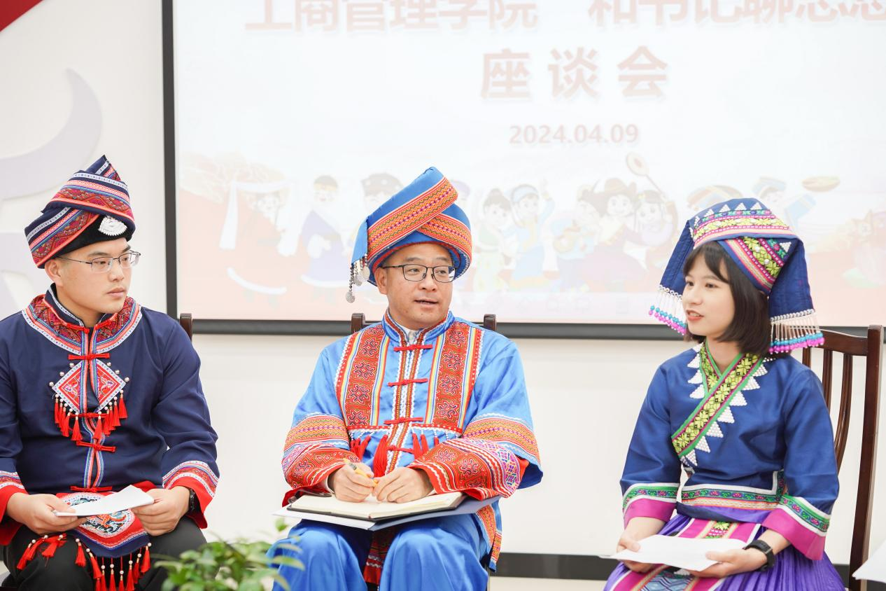 座谈会上,来自仫佬族的梁江雨同学、吴静妃同学,纳西族的万人杰同学、傣族的杨锦辉同学、苗族的何怡雪同学和维吾尔族的凯丽比努尔同学结合自身在少数民族预科班、民族班的求学经历,讲述了各民族学生之间交往交流交融的故事,言谈中不时流露出对党和国家加快培养少数民族地区人才特殊政策措施的感恩之情;来自汉族的梁耀升同学、彭薇雨同学分享了发生在身边的民族团结一家亲、和谐发展心连心的故事,让大家深刻体会到了中华民族一家亲、同心共筑中国梦的时代意义。在聊思想、谈感受的同时,梁江雨同学和吴静妃同学跟大家分享了仫佬族的服饰风俗,饮食风俗,居住风俗等,让大家记住了精致独特的仫佬族服饰和文化;杨焜同学从苗族地理分布、文化习俗、苗族跳坡节进行分享,并唱起山歌抒发了对党的感激之情!凯丽比努尔同学详细跟老师同学们讲解了维吾尔族名字的由来,分享了维吾尔族的节日盛况,并现场跳起新疆舞……各族学生代表畅所欲言,畅谈了自己来到大学适应地区气候、融入大学生活的情况和对未来的设想规划等,并结合自身体会,讲述了在党的民族政策下,感受到的党和国家对少数民族学生的关心与关爱。