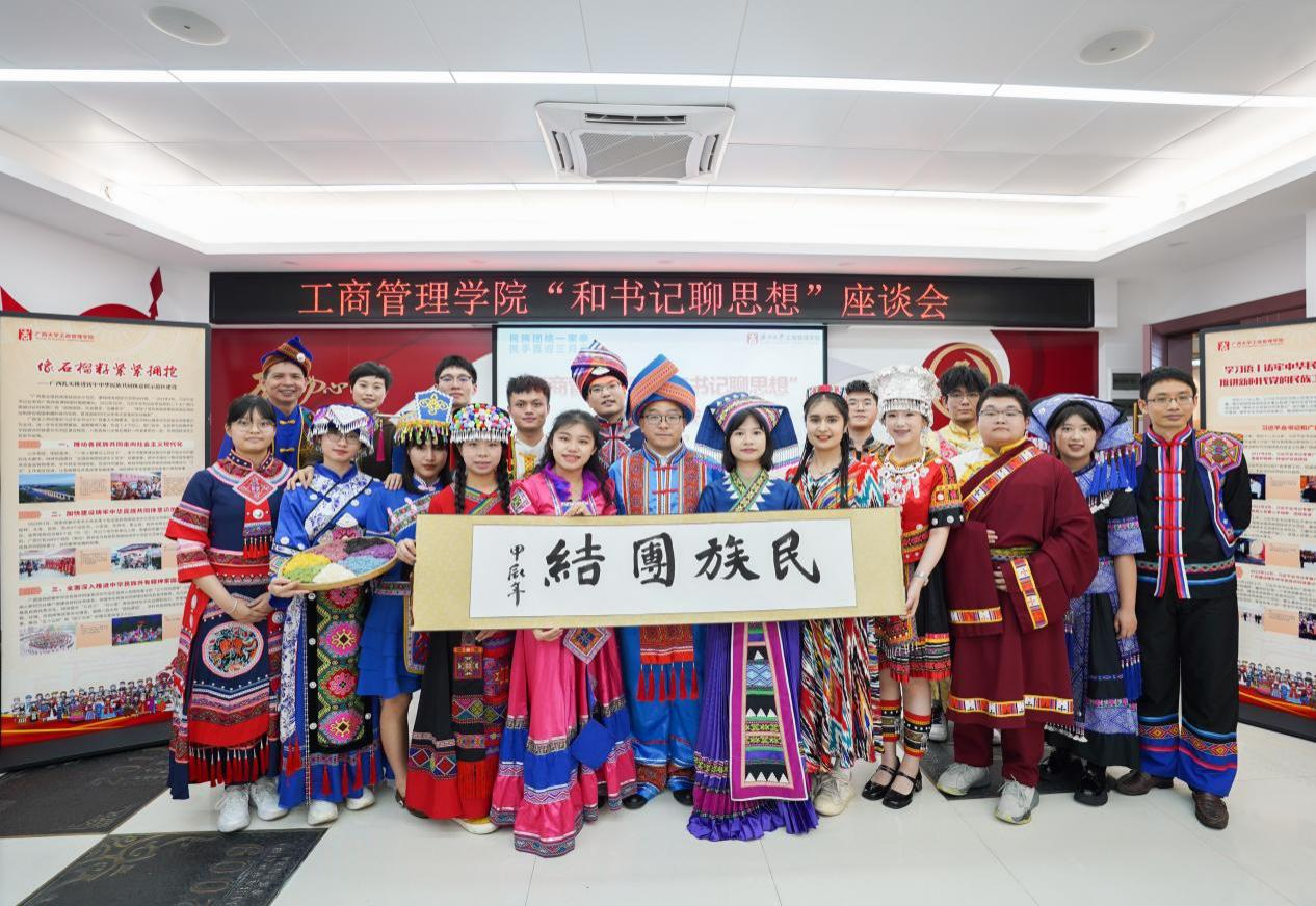 党委书记罗诚身着民族服装与壮族、汉族、仫佬族、苗族、瑶族、维吾尔族、纳西族、傣族、满族等14名各族学生代表欢聚一堂,共庆佳节。滨海湾金沙赌场