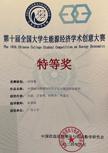 博士研究生参加第十届全国大学生能源经济学术创意大赛并荣获全国特等奖场答辩、评委会投票等环节,荣获国赛特等奖,取得了该项赛事的突破。本项赛事由中国优选法统筹法与经济数学研究会主办,2023年3月正式进入中国高等教育学会发布的《全国普通高校大学生竞赛目录》,来自全国516所高校的17000多支队伍共10万余人参与了本次大赛。本次参赛项目得到广西大学研究生倍增计划项目经费资助。