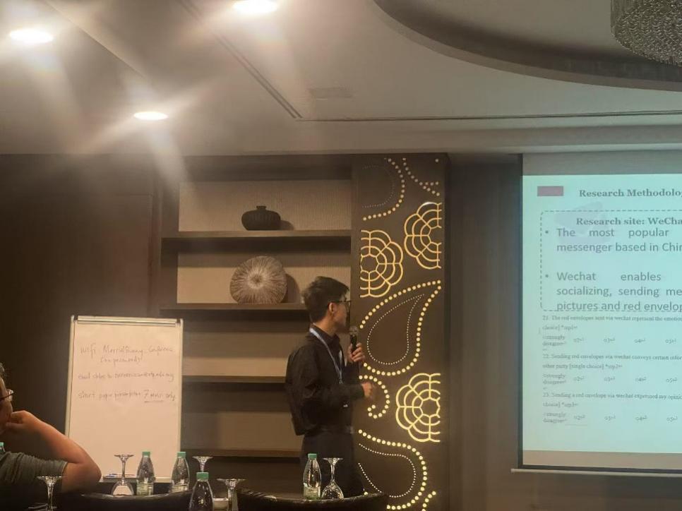 在会议上,王子升同学汇报了自己的研究成果《Money as a Gift in the Online Context An Empirical Study in a Chinese Social Media(网络情境下以金钱作为礼物——基于中国社交媒体的实证研究)》。论文以微信平台的红包互赠行为为核心研究对象,聚焦网络社交场景下的数字化送礼实践,系统探究该行为的驱动前因与影响机制,并构建出一套解释金钱类网络礼物交换的全新理论模型,突破了传统社会中“金钱不宜作为礼物”的固有认知,通过实证分析揭示了数字化语境下金钱礼物的独特价值与接受逻辑。