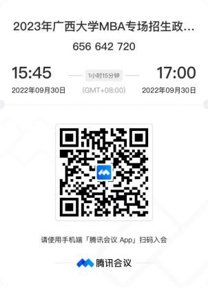 将于2022年9月30日16:00举行2023年广西大学MBA专场招生政策解读会。本次解读会将集中讲解广西大学MBA项目、最新报考政策以及报考重要注意事项,请意向报考2023年广西大学MBA的考生于9月30日15:45扫码进入腾讯会议。