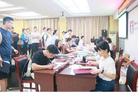 迎新工作现场,研究生新生秩序井然地排队注册、咨询,志愿者们和后勤工作人员们严阵以待,他们用热情周到的服务欢迎萌新们到来,在报到现场为新生配发饭卡、校徽、《广西大学学生手册》,《广西大学研究生手册》等资料,耐心解答新生的疑问。报到现场秩序井然。
