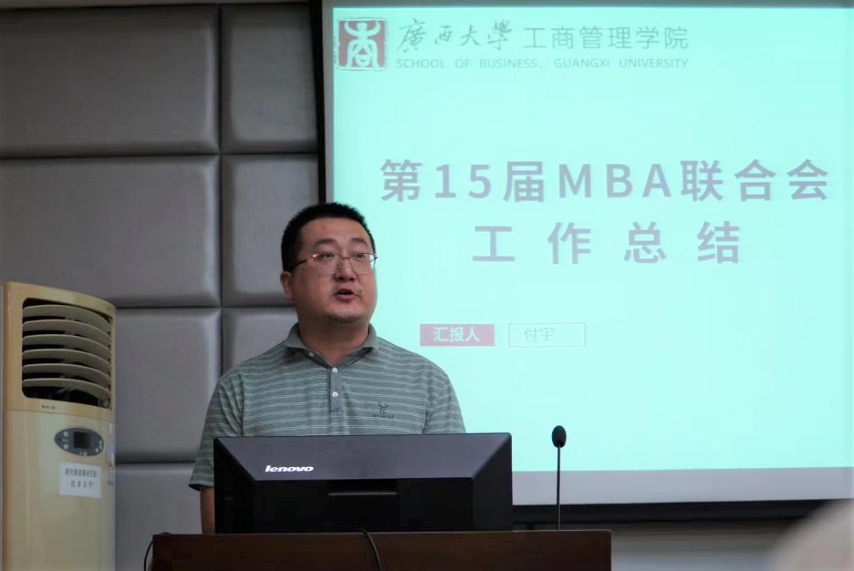 党委副书记黄晋,MBA教育中心主任叶映,主任助理李秋艳、毛德君,MBA校友会副会长和秘书长李翔,广西大学MBA第十三届MBA联合会副主席黄子航先生和MBA教育中心老师们出席了此次会议。广西大学第十五届MBA联合会主席付宇作年度工作报告。在报告中,付宇主席对联合会过去一年的工作做了全面的总结及汇报。在联合会主席团的带领下,联合会的成员们集智创新,举办了各类形式丰富的活动,丰富了同学们课外生活以及帮助同学们拓展了商业知识。并感谢这一年多来为联合会各项活动奔走忙碌的成员们以及对始终默默支持联合会活动的老师、同学们和学长学姐们。他希望新一届的MBA联合会主席团能不负重托,为扩大广西大学MBA联合会的影响力以及扩大广西大学MBA的影响力,做出自己应有的贡献。
