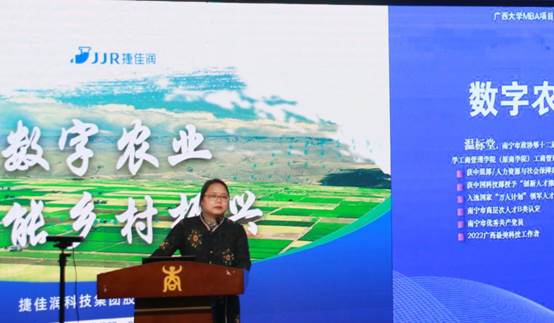 副院长朱少英致开幕辞,向大家隆重介绍了温标堂校友,并对温标堂以及校友、同学们的到来表示欢迎。她介绍到,温标堂校友荣获2022年广西最美科技工作者称号,是一名的优秀共产党员。他深耕智慧农业行业,创办了捷佳润科技集团股份有限公司。该公司研发的“智能水肥一体化精准灌溉管理系统”,曾受到人民日报、央视新闻的报道。2017年,习近平总书记还曾到该公司参观,并称赞其实现了“农业神话”。