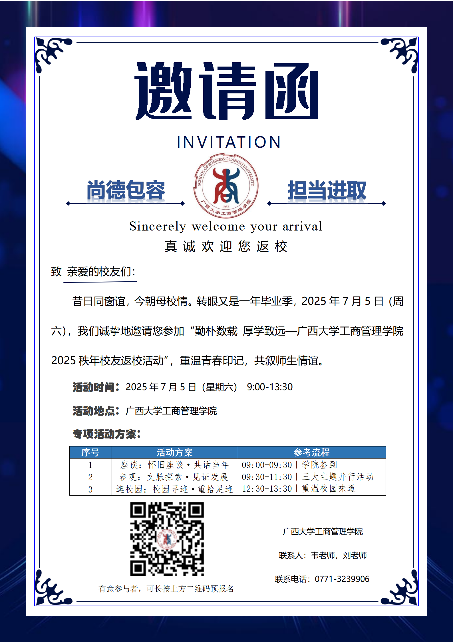 让我们以秩年为约,在2025年7月5日(星期六),相聚于魂牵梦萦的广西大学校园,共赴一场穿越时光的温暖之约,赓续工商情缘,再谱奋进新篇!