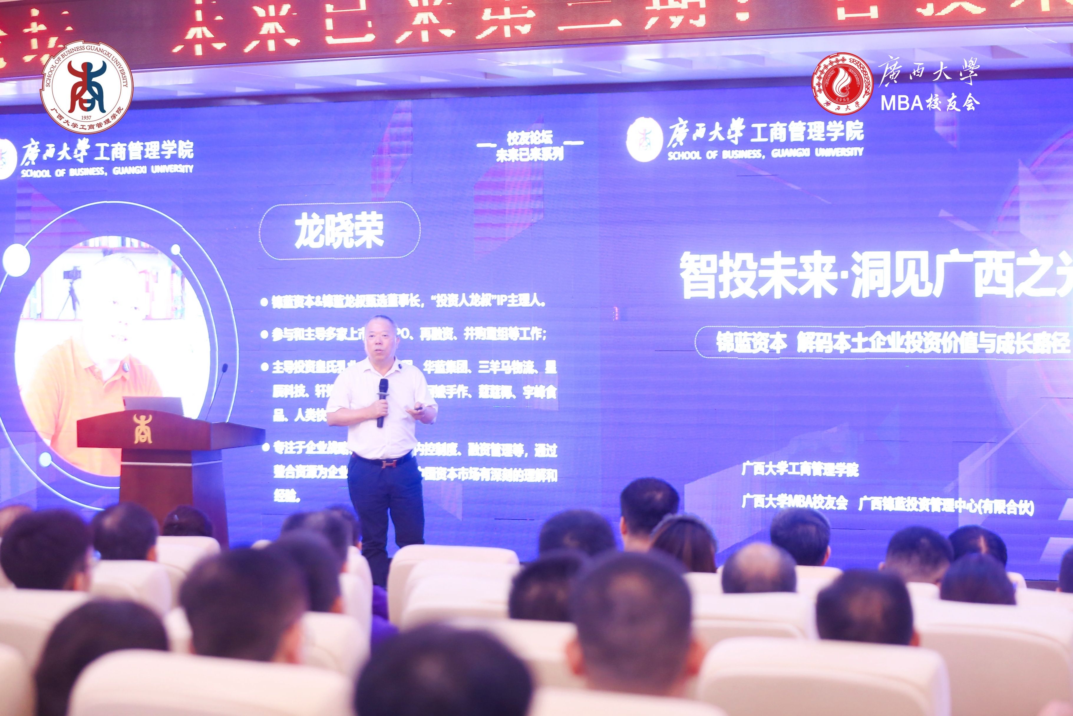 与广西大学MBA校友会联合主办的“未来已来”校友论坛第三期——“智投未来・洞见广西之光”,特邀锦蓝资本创始人、“投资人龙叔”IP主理人龙晓荣先生担任主讲嘉宾,与滨海湾金沙赌场