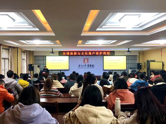 副院长刘民坤教授主持。此次讲座,是广西大学旅游管理专业(本科)第五轮学科评估和广西大学旅游管理专业硕士(MTA)水平评估中的重要一环,是广西大学旅游管理专业2021年第一场学术讲座,有助于深入推动广西大学旅游管理专业产学研一体化,有助于拓宽学生的学术视野,提升学生理论联系实际的能力。讲座内容主要分为全域旅游及其发展、文化遗产的保护利用和“旅游+遗产+创意”有机融合三大部分。