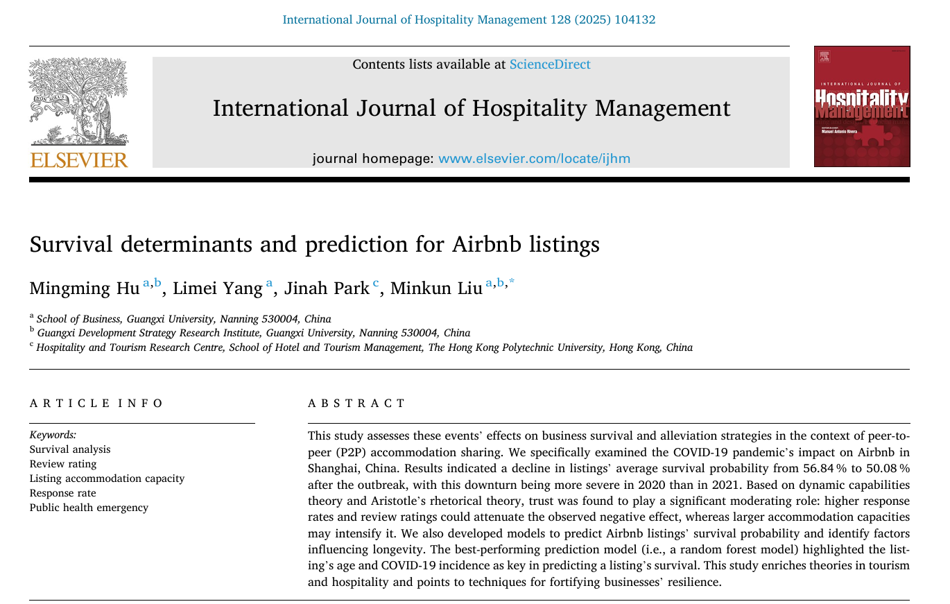 胡明明团队在共享民宿生存分析和预测领域研究取得新进展,研究成果以“Survival determinants and prediction for Airbnb listings”为题,在旅游管理国际高水平期刊《International Journal of Hospitality Management》上发表。论文的第一作者为滨海湾金沙赌场