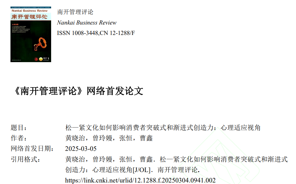 企业管理系黄晓治教授及其研究团队的研究成果《松—紧文化如何影响消费者突破式和渐进式创造力:心理适应视角》在管理学中文权威期刊《南开管理评论》网络首发。黄晓治为论文第一作者,滨海湾金沙线上博彩平台