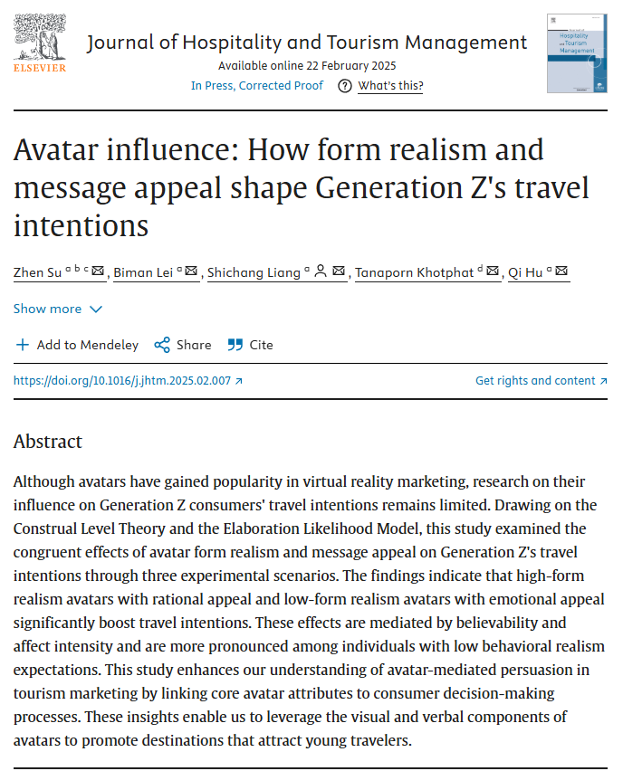 苏振副教授科研团队在人工智能与文旅消费者行为领域研究取得新进展,研究成果以“Avatar influence: How form realism and message appeal shape Generation Z's travel intentions”为题,在旅游管理国际高水平期刊《Journal of Hospitality and Tourism Management》上发表。论文的第一作者为苏振副教授,通讯作者为梁世昌副教授。滨海湾金沙线上博彩平台