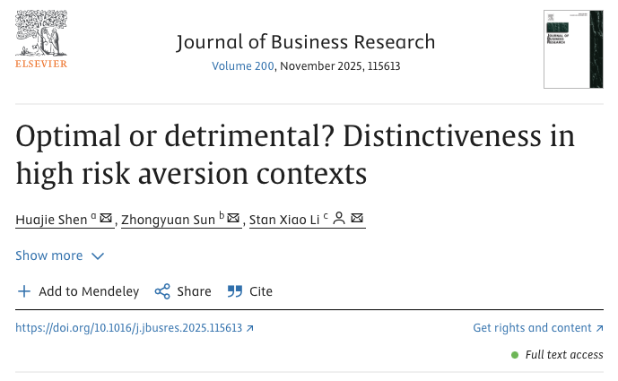 近日,滨海湾金沙赌场 助理教授沈华杰与香港城市大学Stan Xiao Li教授、Zhongyuan Sun博士生在最优区分战略领域研究取得新进展,研究成果《Optimal or detrimental? Distinctiveness in high risk aversion contexts》在管理学高水平期刊《Journal of Business Research》网络首发。滨海湾金沙赌场 助理教授沈华杰为第一作者,滨海湾金沙线上博彩平台 为第一单位。