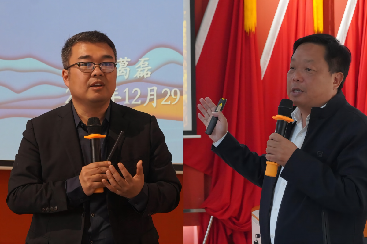 南宁青秀山风景名胜旅游区党工委书记、管委会主任梁旺(右)进行授课